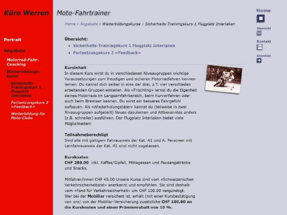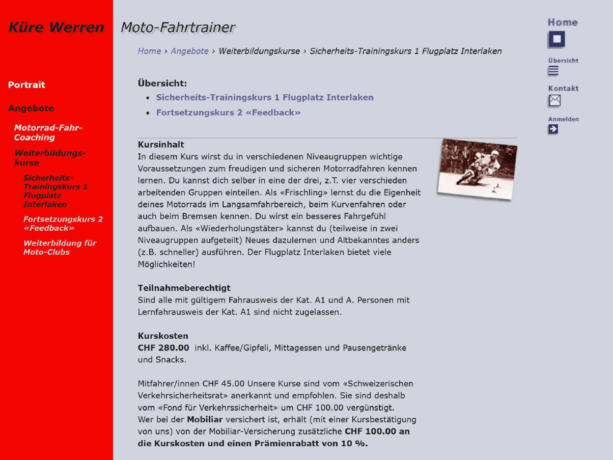 Dieser Weiterbildungskurs wird vom Veranstalter «moto-trainingskurse.ch» durchgeführt, der Kurs ist empfohlen vom Verkehrssicherheitsrat und ist rückerstattungsberechtigt. Deshalb ist er sehr preisgünstig: Im Preis von Fr. 240.- ist die Organisation der Hin- und Rückfahrt, die ganztägige Betreuung in der Gruppe von max. 8 Kursteilnehmern, Znüni- und Zivieri-Kaffee wie auch das Mittagessen inbegriffen. Versicherung ist Sache des Teilnehmers, Vollkasko-Versicherungen sind in einem Weiterbildungskurs gültig. Für das Abendessen und Hotel müssen Kosten von etwa Fr. 100.- (im DZ) eingeplant werden. Die Anfahrt am Vorabend kann auf eigene Faust geschehen oder innerhalb verschiedener Gruppen gewählt werden, entsprechende Angaben bekommst Du kurz vor dem Kurs. Die Bezahlung des Kurses aller Teilnehmer der Tramstrasse geschieht über Urs Tobler, Du kannst die Angaben zu meiner Bank unter «Kontakt» finden oder einen Einzahlungsschein als PDF [97 KB]