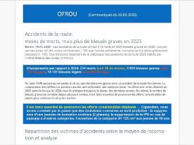 Berne, 19.03.2026 Accidents de la route: moins de morts, mais plus de blessés graves en 2025 Communiqué de presse à télécharger au format PDF [171 KB]