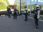 Genau um 9 Uhr wechselten wir auf das Gelände des Strassenverkehrsamtes. Da es ein Signat hat «Einfahrt verboten» (für all jene, die keine Bewilligung haben), müssen wir die Motorräder etwa 20 Meter weit schieben - eine gute Übung frühmorgens, der härteste Job habe ich mit dem Einradanhänger ...