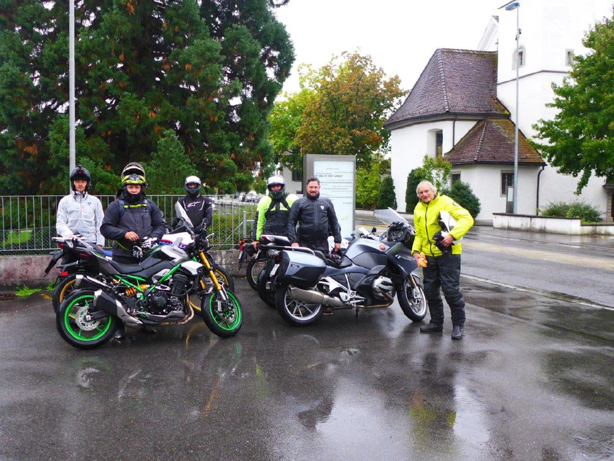 Da ich das Areal des Strassenverkehrsamtes mieten muss, brauche ich mindestens 6 zahlende TN, um den Kurs durchzuführen. Meistens findet er vor dem WB-Kurs in Interlaken statt, wobei Oster- bzw. Pfingstsamstag bisher eher ein Handicap war. Aufgrund der katastrophalen Wettersituation um den 20. April musste der Kurs in Interlaken kurzfristig abgesagt werden. Als ich dann eine Woche vor Pfingstsamstag erstmals die srf-meteo konsultierte, erlitt ich einen Schock – ging aber ohne Notarzt über die Bühne – im Hinblick auf das KT2-Programm: Nach dem KT1-Kurs, in welchem es in erster Linie um eine saubere Kurvenfahrtechnik (Kurvenlinie, Blicktechnik und Geschwindigkeitsgestaltung) geht, sollten im Kurs 2 die fahrer- und maschinentechnischen Reserven erkundet werden. Nasse Fahrbahn ist da ein brutaler Spielverderber, im Gegensatz zum KT1, wo oft die Teilnehmenden im Regen schräger gefahren sind als je zuvor.