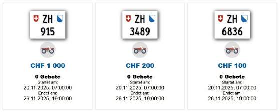 Während der Hochsaison wurden jede Woche ein 3-, sowie sechs 4stellige Töff-Nummernschilder versteigert: Im Winter sind es ein 3-stelliges, bzw. nur noch deren zwei 4-stellige: |