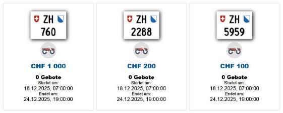 Während der Hochsaison wurden jede Woche ein 3-, sowie sechs 4stellige Töff-Nummernschilder versteigert: Im Winter sind es ein 3-stelliges, bzw. nur noch deren zwei 4-stellige: