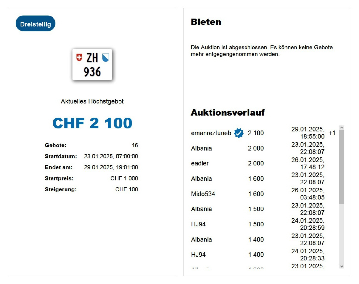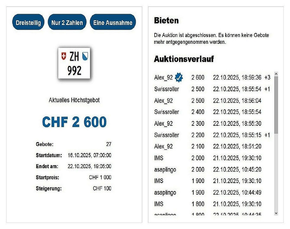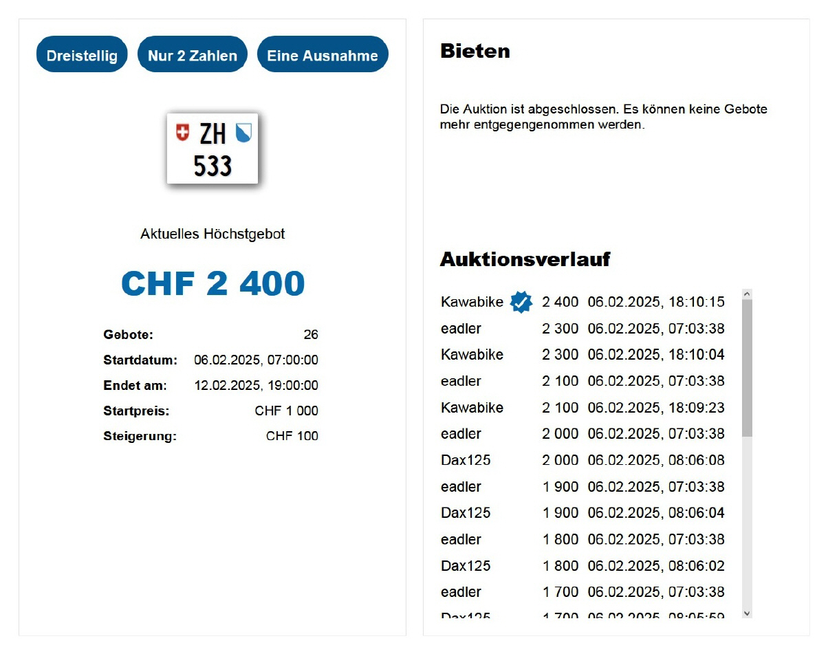 Am 25.11.2020 wurde im Kanton Zürich das 3-stellige TÖFF-Nummernschild ausgegeben - in der Auktion ging es für Fr. 4000.- weg: Auch hier boten sich zwei Bieter hoch! Verfolge den Verlauf vom «ZH 701