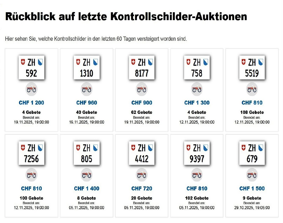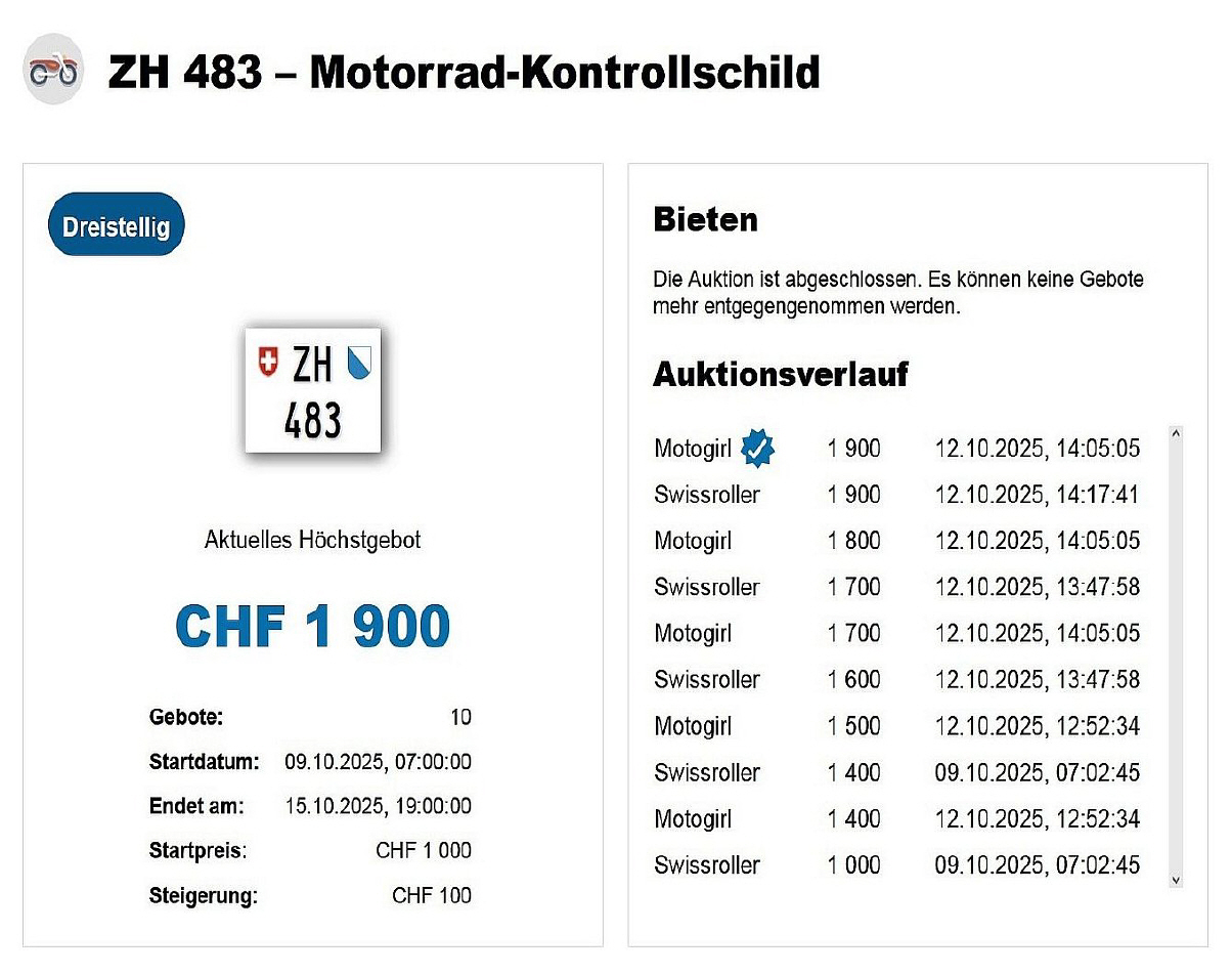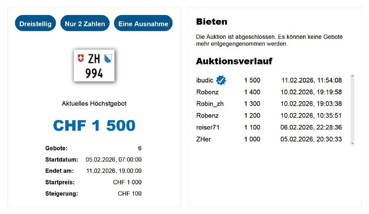 Am 25.11.2020 wurde im Kanton Zürich das 3-stellige TÖFF-Nummernschild ausgegeben - in der Auktion ging es für Fr. 4000.- weg: Auch hier boten sich zwei Bieter hoch! Verfolge den Verlauf vom «ZH 701