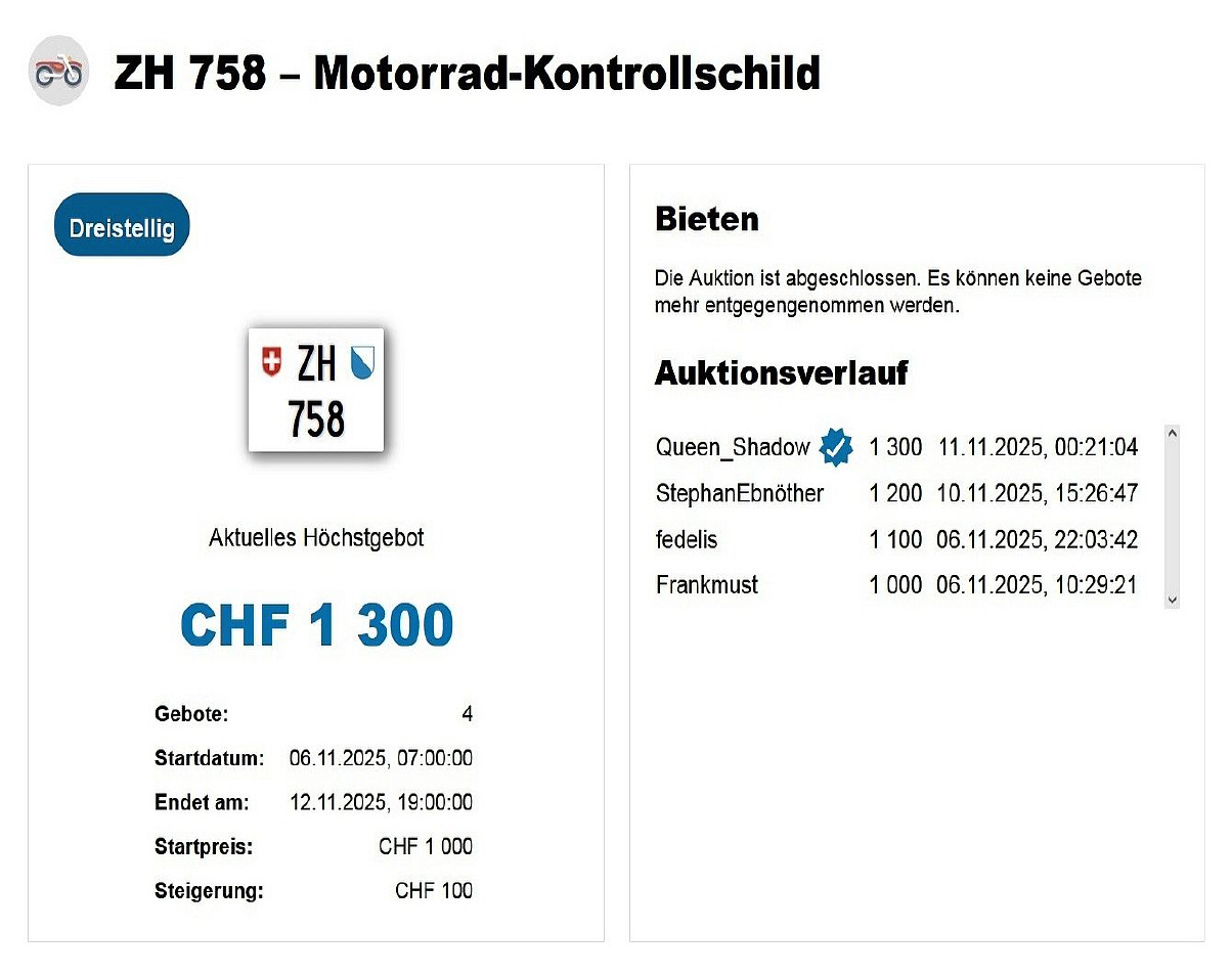 Am 12.11.2025 wurde im Kanton Zürich das nächste 3-stellige TÖFF-Nummernschild ausgegeben - in der Auktion ging es zum äusserst tiefen Preis von nur Fr. 1300.- weg! Verfolge den Verlauf vom «ZH 758