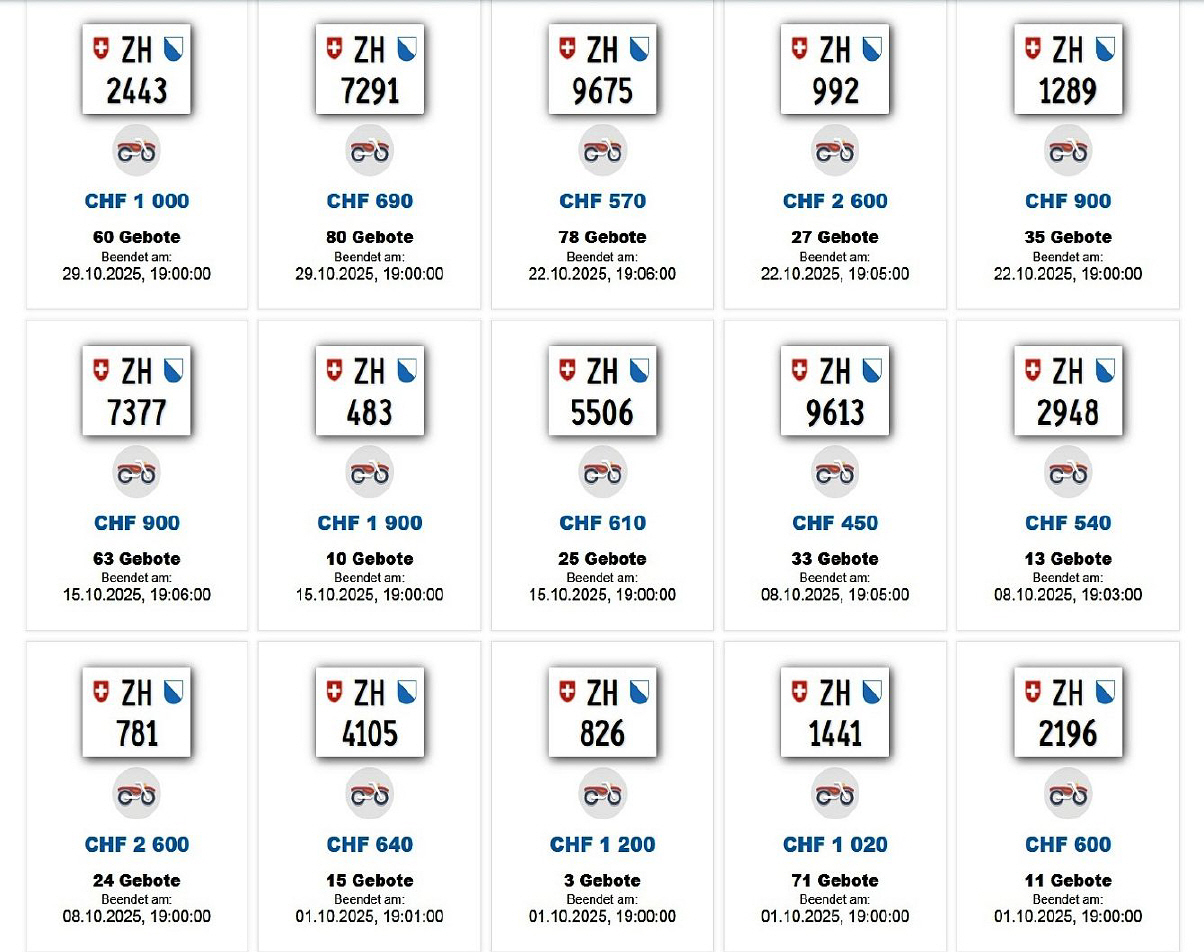 Am 16.07.2025 wurde im Kanton Zürich das nächste 3-stellige TÖFF-Nummernschild ausgegeben - in der Auktion ging es zum für die Kombination günstigen Preis von Fr. 2100.- weg! Verfolge den Verlauf vom «ZH 477