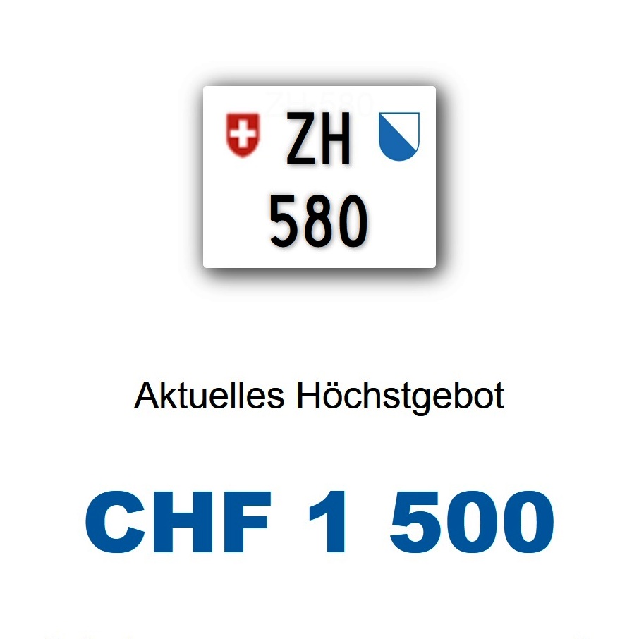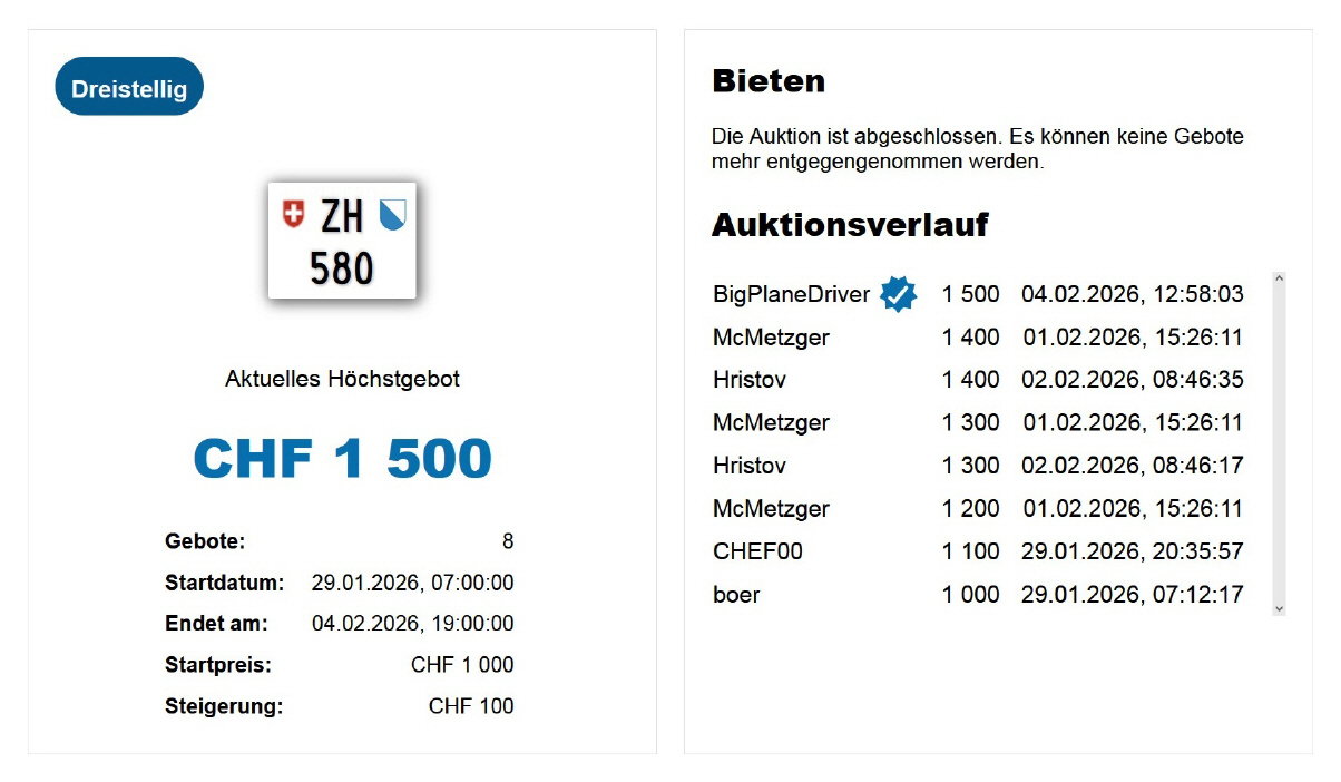 Am 04.02.2026 wurde im Kanton Zürich das nächste 3-stellige TÖFF-Nummernschild ausgegeben - in der Auktion ging es zum äusserst tiefen Preis von nur Fr. 1500.- weg! Verfolge den Verlauf vom «ZH 580