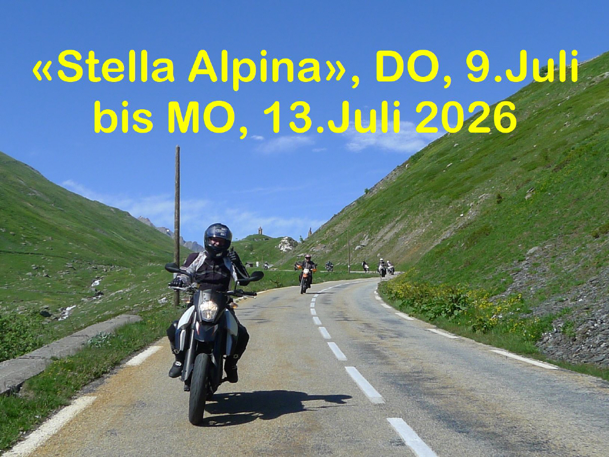 Die alternative Variante der «Stella» ist nun eine 5-tägige Töff-Tour anlässlich der Stella-Alpina vom DO, 7.Juli bis MO, 11.Juli: Diese Ausfahrt kann mit jeder Strassen-Enduro oder -Maschine gemacht werden, es besteht die Möglichkeit das Gepäck im Begleitfahrzeug transportieren zu lassen. Der HiAce-Bus dient sowohl als Gepäck-Fahrzeug wie auch als Notfall-Fahrzeug für gestrandete Fahrer(innen) oder Maschinen ... Die Kosten belaufen sich pro Person auf Fr. 550.-, Einzelzimmerzuschlag Fr. 100.- Theoretisch wäre eine Rückkehr auch bereits am Sonntag, 10.Juli möglich, wer diese Tour aber voll auskosten möchte, sollte unbedingt die 2tägige Rückreise mitmachen!