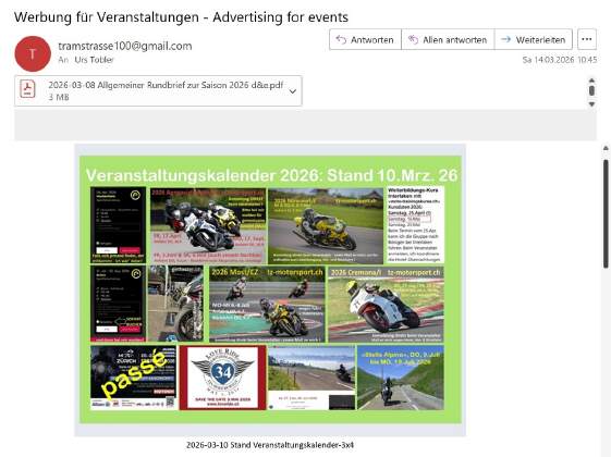 Dieses E-Mail ging ENDLICH am Sonntag, 8.Febr. 2026 raus. Eigentlich hätte es schon am 5.Febr. abgesandt werden sollen, aber inzwischen konnte ich für die «MotoZürich» noch eine Verbilligung von 20% organisieren auf Online-Tickets, die vor dem 12.Febr. gelöst werden! Also nicht zögern, zupacken!
