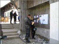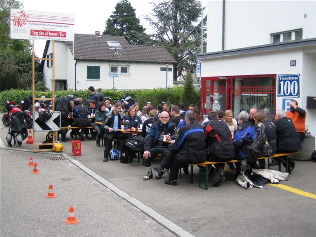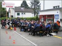 Da das Rest. Heitersberg am Montag nicht geöffnet ist, installierten wir uns in der «Garage» (kleine Holzscheune) vis-à-vis. Der Wirt stellte Tisch und Bänke auf und Getränke - die vom Haus offeriert wurden! Christian Leutwyler nahm sich die Mühe und Zeit, mit dem Thema «Helm ab» einen Geschicklichkeitsposten einzurichten. Es mussten auf Zeit mehrere verschiedene Helmverschlüsse geöffnet werden - nicht immer ein einfaches Unterfangen, wie es sich herausstellte.
