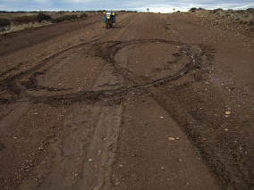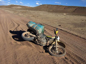 Dass Aschi als Motorradfahrer unterwegs ist, ist nicht nur ein Zufall: Als Töff-Fahrer kommt man einfacher an die Leute heran, man ist (vor allem in dieser Region!) nicht ein Tourist unter vielen und es zeigt sich immer wieder, ob wegen Sturz oder technischem Defekt, dass Töfffahrer für einander da sind. Seine ausgewählte Reisemaschine, eine Suzuki DR650 ist eine überaus robuste Einzylinder-Maschine, die, falls nötig, wie immer wieder von neuem durch ortsansässige Mechaniker bewiesen, sich auch mit irgendetwas reparieren lässt. Diese Details und Bilder der «Spuren» von beinahe- und ausgestandenen Stürzen lassen die Erlebnisse hautnah mitverfolgen. |