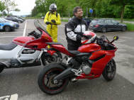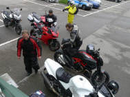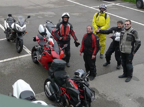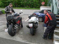 Entgegen den Prognosen sah es um zwei Uhr gar nicht so schlecht aus: Alle hatten mit dem schlimmsten gerechnet und sich deshalb in die Regenkleider gestürzt. Arthur mit dem leuchtend gelben BMW-Regenkombi auf seiner nigel-nagelneuen KTM Adventure - womit hat die KTM das verdient? Die laubgrünen Fischerhosen von Roman mögen wohl wasserdicht sein, aber auf der eleganten Sporttourenmaschine VFR1200 beging er damit eher einen Stilbruch. |