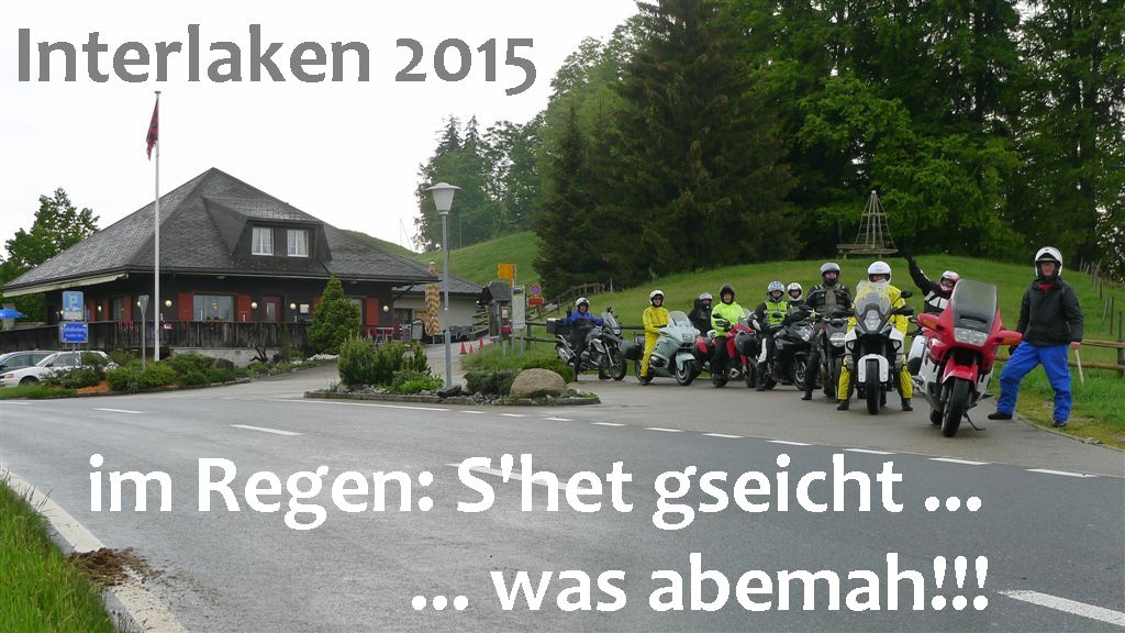 Bei diesen Wetterverhältnissen wollten wir so früh als möglich am Ziel sein und deshalb fuhren wir bereits in Steffisburg auf die Autobahn. Aus der Autobahn wurde es nach Spiez eine Autostrasse, bevor wir in Interlaken wieder den Status einer Autobahn erhielten. Doch schon bald mussten wir sie verlassen, denn Bönigen war unser Ziel. Diejenigen mit kleinem Tank gingen noch erst tanken, während Frank und ich gleich weiterfuhren. Arthur's Gruppe hatte eine Garage erhalten, wir parkten unsere Töffs draussen neben Philipp, der über die Autobahn angefahren war: Später los und früher da, bestimmt aber mit bedeutend weniger Kurven ...