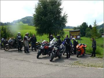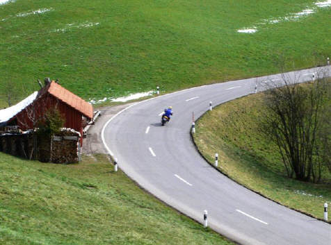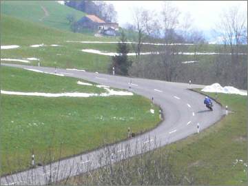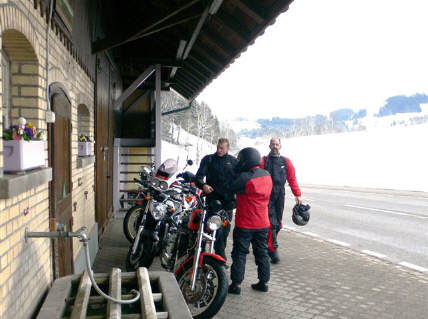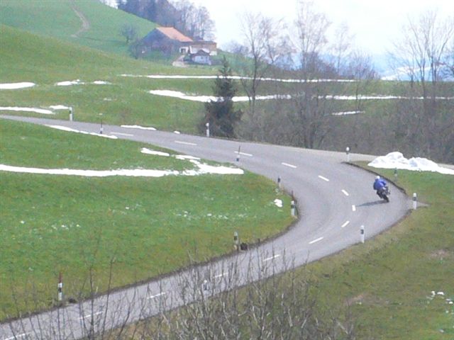 Nur ein Teilnehmer, Rolf aus Bubikon, wagte die Fahrt über die Hulftegg. In der ersten Rechtskurve nach der Passhöhe sah er die Oberfläche glitzern: Mit null Grad Schräglage rollte er Richtung Ziel...