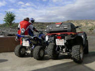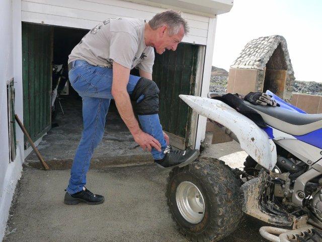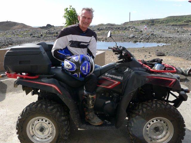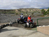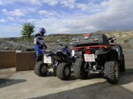 Steff konnte mich gewinnen, es wenigstens zu versuchen, nachdem ich ihm den ganzen Abend vorher klargemacht habe, dass mir Töff mit Seitenwagen (und analog in dem Fall Quad) keine Freude machen, weil man nicht in die Kurve liegen kann: Querbeschleunigungskräfte sind dem (einspurigen) Töff fremd! Es standen zwei Quads zur Verfügung, der eine leicht und sportlich, der andere schwer und behäbig. Ich entschied mich für den leichten, entgegen Steffs Empfehlung. Die erste Schwierigkeit bestand darin, dass am Lenker mit Daumengas gearbeitet werden musste. Ich versuchte umsonst den Gasgriff zu drehen ... Die zweite Schwierigkeit war die, dass das Ding trotz Töff-Lenker DIREKT gelenkt werden muss. Ich versuchte es mit Gegenlenken und stand gleich quer, zum Glück noch auf und nicht neben der Piste. Steff fuhr voraus auf einen Übungsplatz: Hier konnte ich zwar driften (man kann ja nicht umfallen!), aber zurück auf dem Fahrweg, stellte ich mich ziemlich doof an, hielt mich fest und war total verkrampft. Endlich liess ich mich überreden, es doch besser mit dem grossen Gerät zu versuchen. Dies ging dann wirklich viel besser - und alles vollautomatisch! |