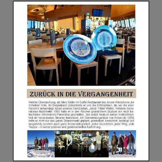 in der Aroser Zeitung zu unserem Grossvater Jakob Tobler-Weber, der als Eismeister im Jahr 1946 die Pferderennen auf dem Obersee verbieten musste, da das Eis zu wenig mächtig war, um eine sichere Durchführung zu gewährleisten. 2016 wurde das als Folge des Klimawandels dargestellt, doch 1946 war der Winter auch lau, die Temperaturen lagen zu hoch für die Eisbildung. Bei einem Ausflug aufs Weisshorn stellte sie fest, dass dort das Panorama unseres Grossvaters fehlte: Ob es wohl überlebt hat? Dies war der erste Kontakt mit den Aroser Bergbahnen, wo ihr Mail auf dem Konto des CEO Philipp Holenstein landete. |