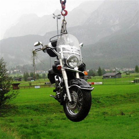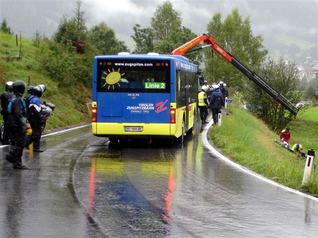 In der Bergungsfirma nahm ich mit meiner Tourenversicherung (MobiTour) Verbindung auf. Die Frau des Bergungsunternehmers kochte uns eine feine Suppe und versorgte mich mit Schmerztabletten. Dann telefonierte die Versicherung, dass in Garmisch ein Mietwagen bei Avis für uns reserviert sei. Wir waren aber in Österreich, doch Garmisch war die nächste grössere Stadt. Noch während wir am Töff die Taschen abnahmen... |