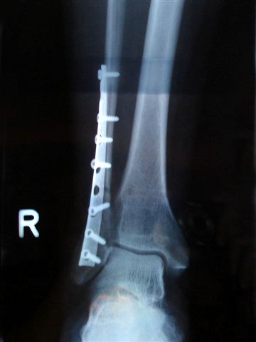 ... legte ich mich ins Bett, damit die Verstauchungsschmerzen nachlassen. Als es am anderen Morgen noch immer schmerzte, brachte mich Vreni zum Hausarzt, zum röntgen. Und anschliessend gleich ins Spital, das Wadenbein war gebrochen. Inzwischen war das Bein so angeschwollen, dass mit der Operation ein paar Tage gewartet werden musste. Titanblech, Schrauben, Gips. Wobei der Gips längst nicht mehr aus Gips ist, sondern aus 2-Komponenten Kunststoff. |
