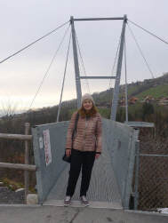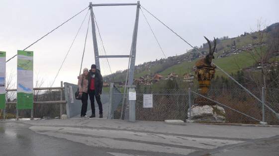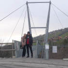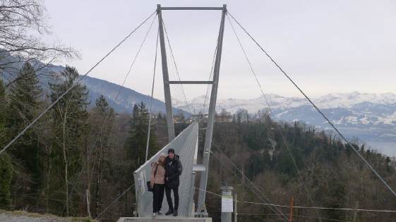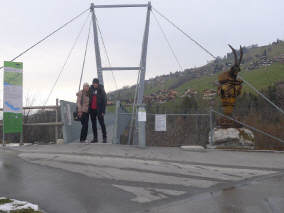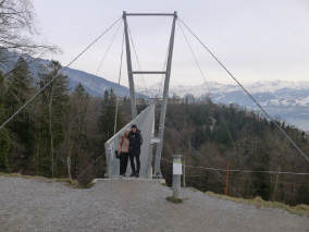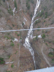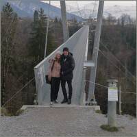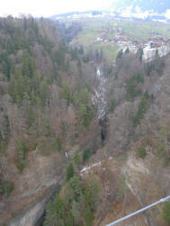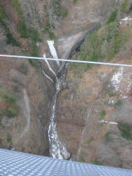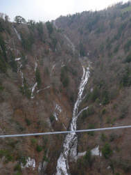 Die Hängebrücke ist sehr stabil: Natürlich merkt man Schwingungen, wenn jemand anders ebenfalls über die Brücke geht. In der Mitte machten wir einen Halt und fotografierten in die Schlucht hinunter: Der Anblick von ein paar vereisten Wasserfällen zeigten Winterbilder, wir machten Bilder hangaufwärts und hinunter zum See. Die Höhe ist schwindelerregend! Die Distanz bis zur anderen Seite hielt sich in Grenzen. |