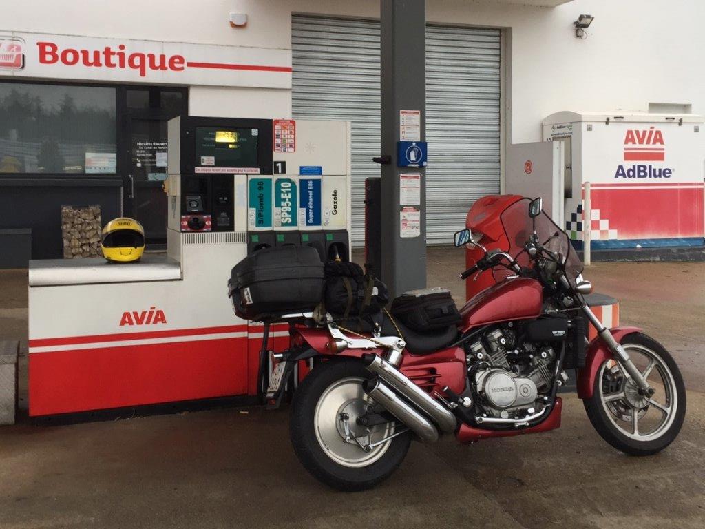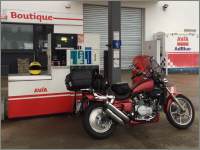 Ein historischer Tankhalt: Vier Mal in meinem Leben bin ich buchstäblich «auf dem letzten Tropfen» mit stotterndem Motor an die Tankstelle gerollt, zwei Mal mit der alten GoldWing (Mollis, Glattzentrum), ein Mal mit der neuen GoldWing in Hedingen rtg. Affoltern und nun mit dieser Maschine hier. Zu meiner Entschuldigung, hier wusste ich natürlich nicht, wie lange die Reserve reicht. Dass es gar nicht mehr gereicht hat und Benzin organisieren musste, passierte mir mehrmals – zum letzten Mal auch mit dieser Maschine: Ich hatte vergessen, den Reservehahn zurückzustellen und es war durch das schnelle Fahren etwa um 40 Kilometer früher als erwartet passiert … Das krasseste Erlebnis diesbezüglich passierte in Deutschland auf dem Weg zur Nordschleife, wo wir auf einem Autobahnparkplatz mit dem Plastikdeckel der Rasierschaum-Dose das Benzin abgezapft und eingefüllt hatten, das natürlich auch mit einer fremden Maschine. |