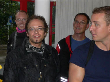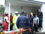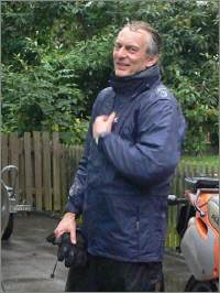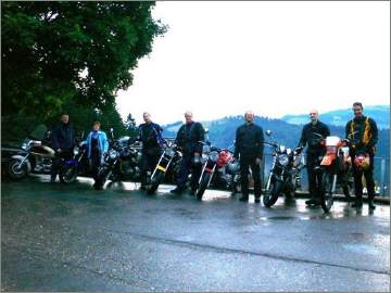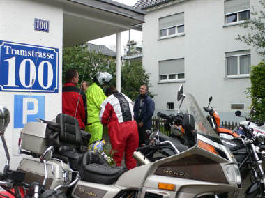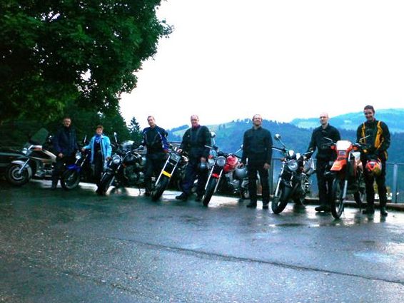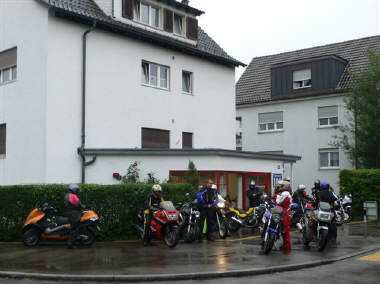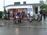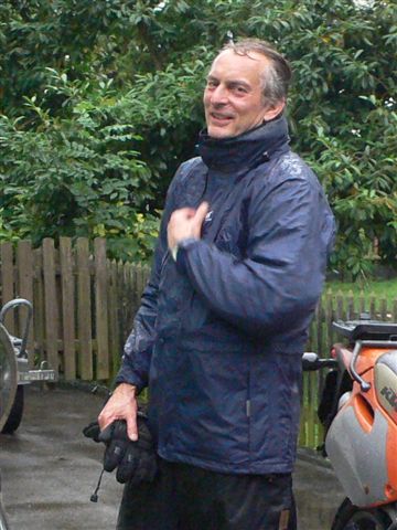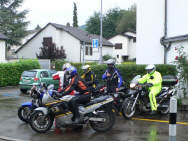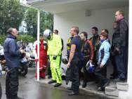 Es sind diesmal einige Leute da, die zum ersten Mal an der Donnerstagsausfahrt teilnehmen. Für die wiederholt Urs die Gruppenfahrregeln. Das «Versetztfahren» auf breiten Strassen ist bereits bekannt. Wichtig ist, damit niemand verloren geht, dass immer der Vordermann die Verantwortung wahrnimmt für den nächstfolgenden Fahrer: Niemand darf von dem Weg abbiegen, ohne sich zu vergewissern, dass der Hintermann die Abbiege-Absicht erkannt hat. Erst wenn dieser den Blinker gestellt hat, darf abgebogen werden. Dies erlaubt jedem, seine eigene Geschwindigkeit bis zum nächsten Abbiegen zu fahren - damit bleibt der Fahrspass erhalten. Bild rechts: Nach den vielen Regentagen in diesem Sommer, lässt sich Urs auch vom Regen nicht gross beeindrucken: Schliesslich findet die Töff-Prüfung auch im Regen statt!!! |