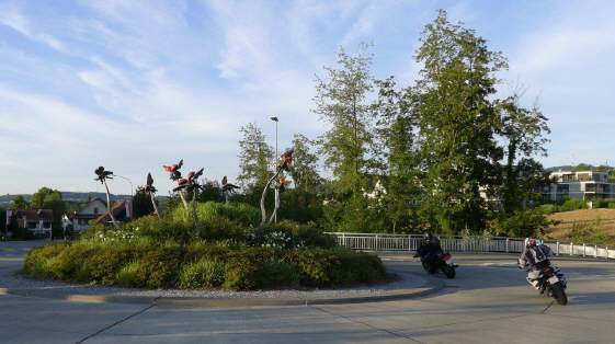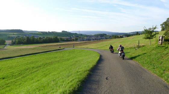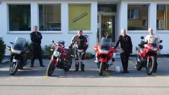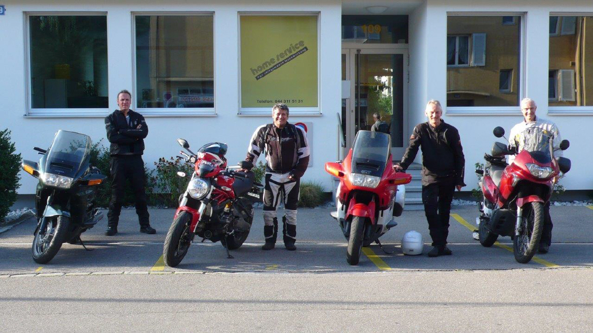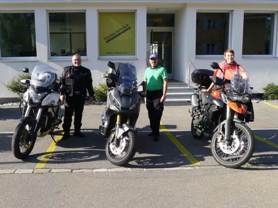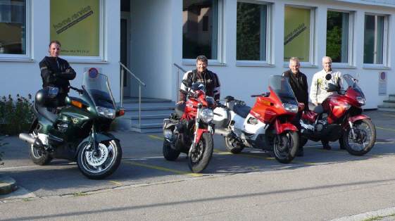 Als ich um 18 Uhr an der Tramstrasse 109 eintraf, standen drei Maschinen auf dem Parkplatz: Neben Alain war auch Urs da und zusätzlich Miriam, die sich diese Gelegenheit nicht entgehen lassen wollte. Sie starteten zu dritt auf den Weg durch die Stadt zum Parkplatz in der Waldegg, wo um halb 7 Uhr noch Hugo als Vierter zur Gruppe stiess. Gemeinsam nahmen sie den Weg unter die Räder, sie hatten ja Zeit «zum versauen» .... |