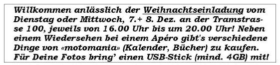 auf der Rückseite der Einladung… Wer sich für diesen Weiterbildungskurs interessiert, hat auch im kommenden Jahr diese Chance: Wenn auch nicht günstig, aber mit Garantie mit grossem Lerneffekt! Meine Lebenspartnerin ist noch immer ganz euphorisch, wenn sie an ihre Erlebnisse auf dem Ring zurückdenkt. Sie wird an der Weihnachtseinladung ebenfalls dabei sein, falls Du sie darauf ansprechen möchtest. |