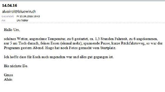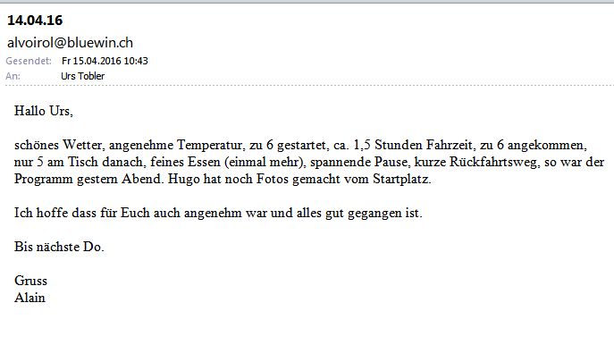 Alain hat mir ein Mail gesandt, dass die Ausfahrt 1 1/2 Stunden gedauert hat und dass von den 6 Teilnehmern 5 einen ganz feinen Znacht gegessen haben im Rest. Hochwacht. Weitere Angaben und Bilder folgen! |