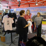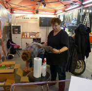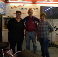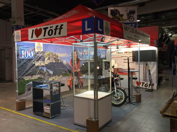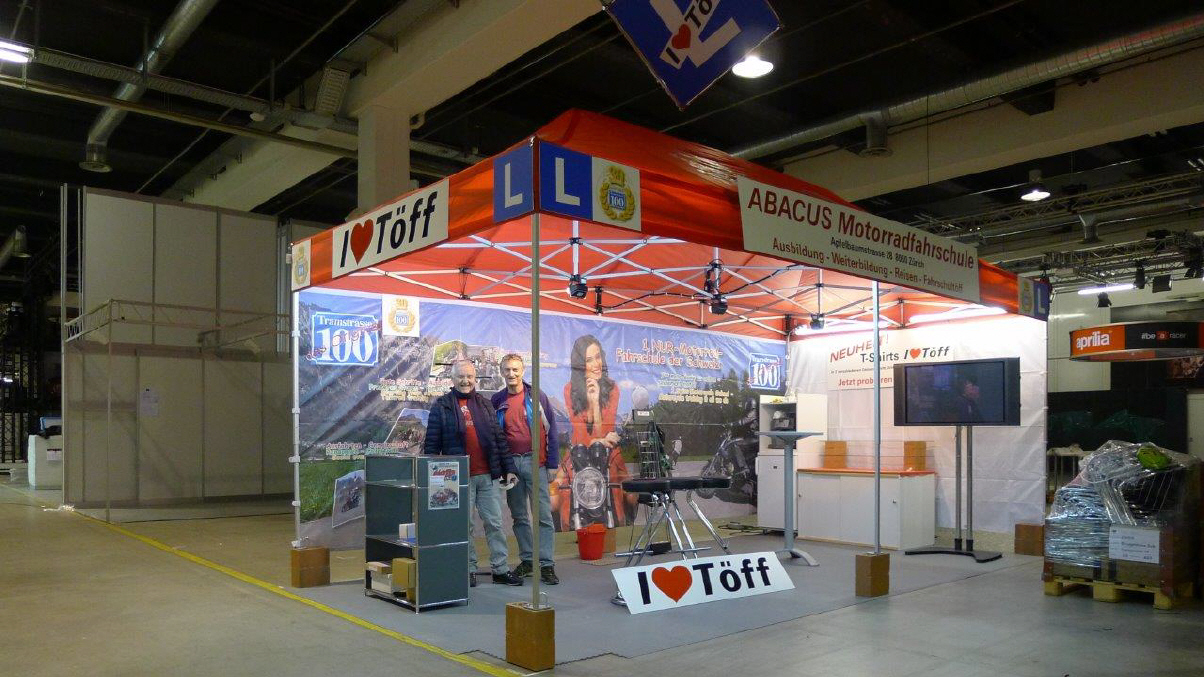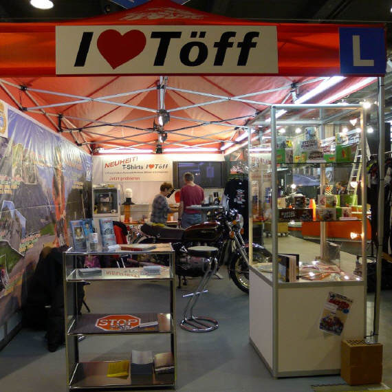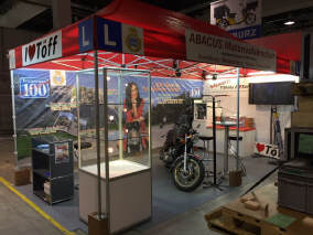 Die grosse Abwende ist «Anna, meine Stand-Mate»: Sie hat kürzlich eine neue Stelle angetreten und ist in der Probezeit. So muss ich - leider! - auf ihre Mitwirkung in diesem Jahr verzichten. Doch ihre Mutter Elvira, unter grosser Mithilfe von ihrer Freundin Lilian, srand wie immer auf dem Teppich und organisierte alles wie immer. Die «motomania»-Artikel in der Vitrine, dann die diversen T-Shirts und die Preise anschreiben, was halt alles so dazugehört. |