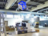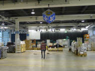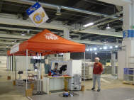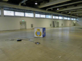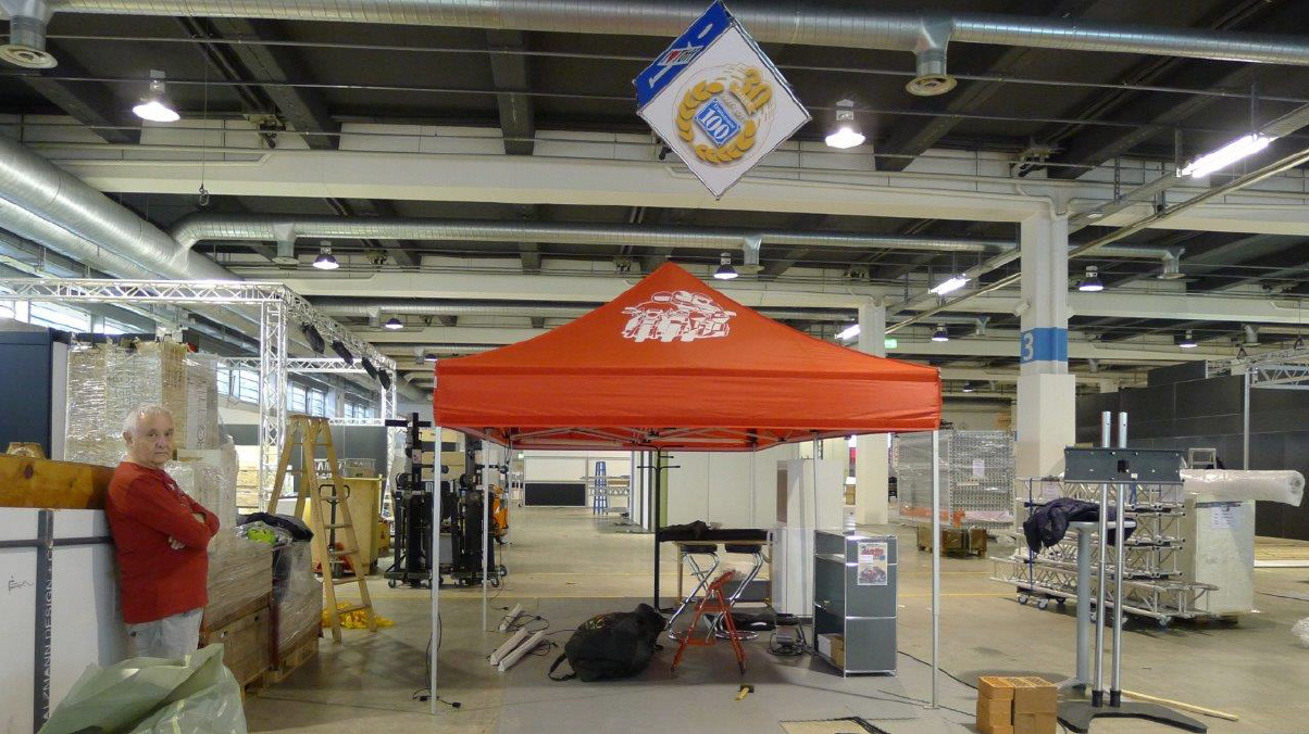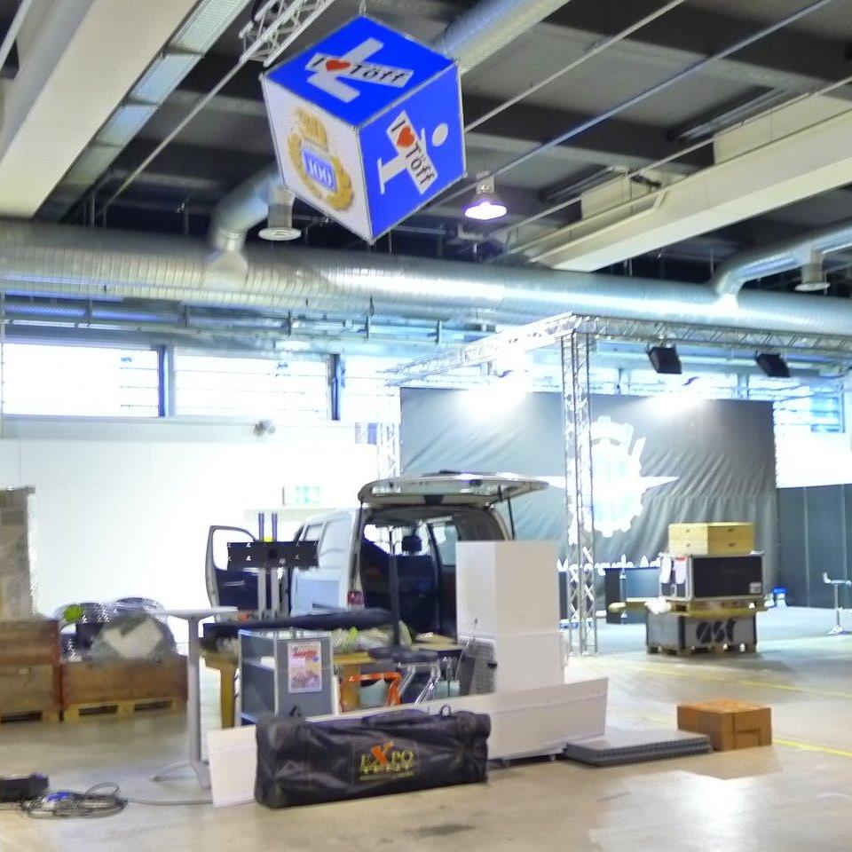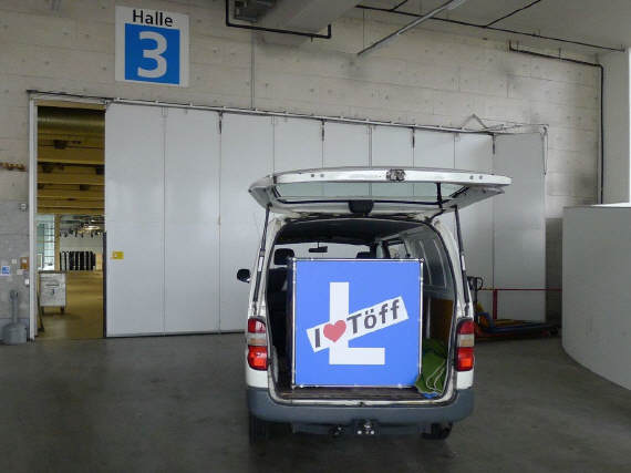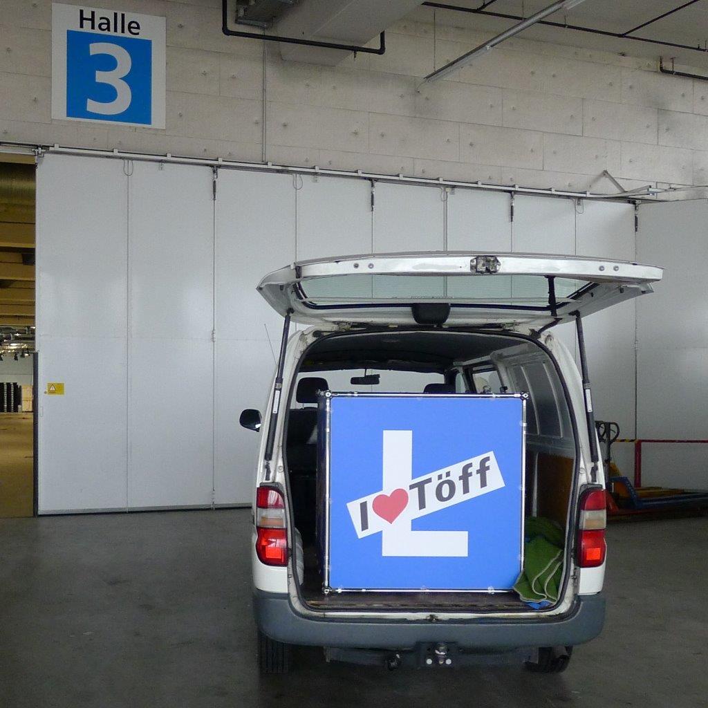 Da es vor allem im letzten Mal zu erheblichen Verzögerungen beim Aufbau des Standes kam, weil der Würfel zu wenig hoch aufgehängt worden war, habe ich mich früher darum gekümmert. Ich holte ihn bei Holdener Reklame in Zürich-Altstätten ab und lieferte ihn bereits am Freitagnachmittag um halb 2 Uhr in der Halle 3 ab. So konnte sich das Winkler Team Zeit lassen - und siehe da, am Samstag hing er bereits in der Höhe! Merci, Sämi für den guten Service. |