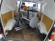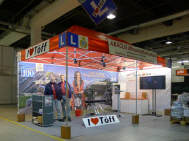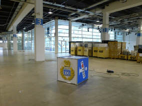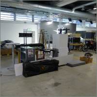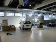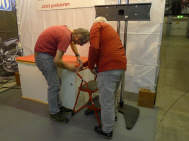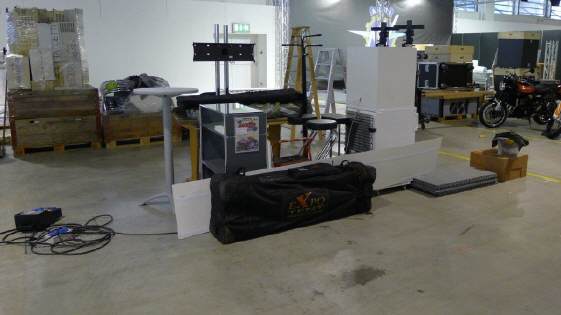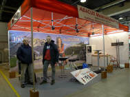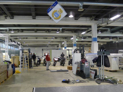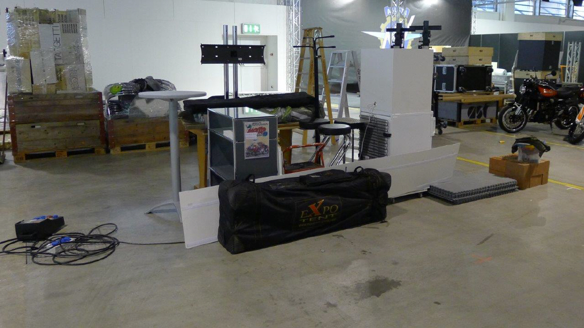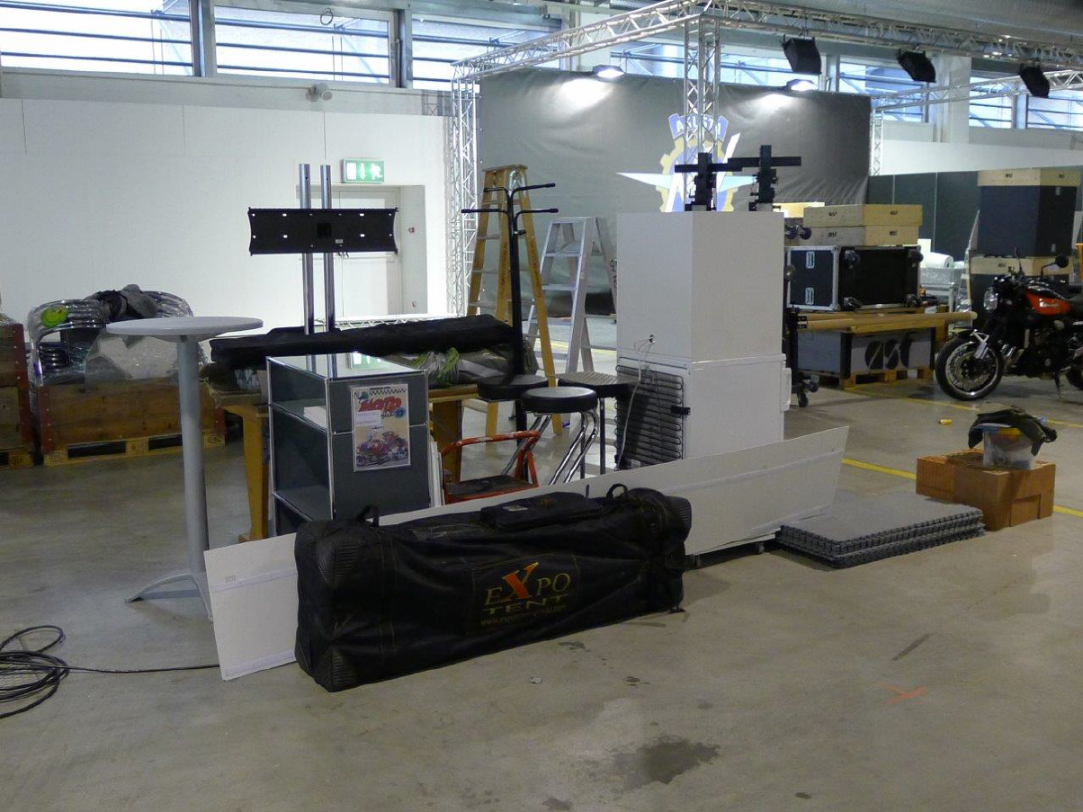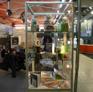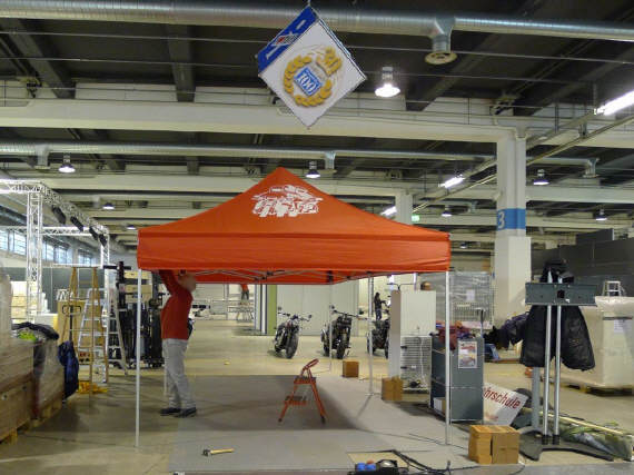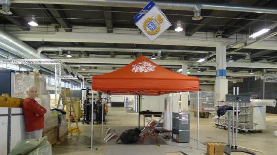 Ein Privileg, von dem ich seit Jahren profitieren darf, ist die Bewilligung von Pierre Werner, dass ich bereits am Samstag, wenn die Halle noch fast leer - in diesem Jahr noch nicht komplett überstellt! - ist, mein ganzes Standmaterial anliefern darf. Renato Romantini stand mir tatkräftig bei, das Material zusammenzutragen an den verschiedenen Standorten. (Apfelbaumstrasse, Magdalenenstrasse, Tramstrasse) Dann fuhren wir zur Messe, wurden anstandslos und höflich rein gelassen und durften unsere Busladung «löschen». So steht jetzt unter dem hängenden L-Würfel alles bereit, um am Montag loszulegen. |