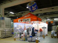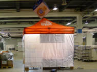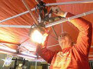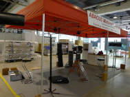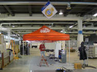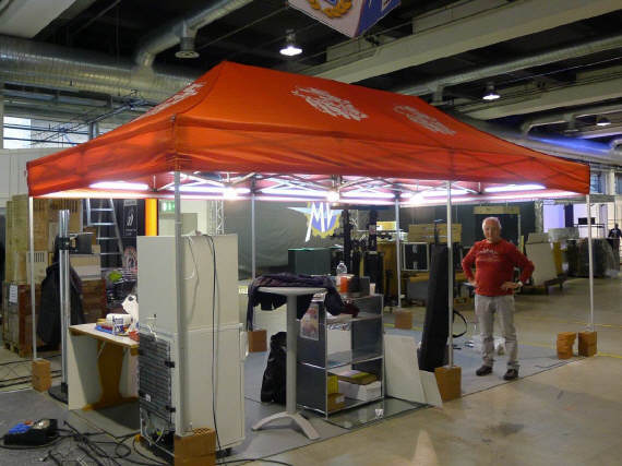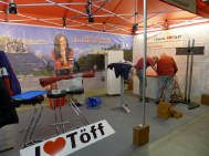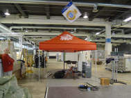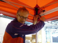 (Fast) Pünktlich um 9 Uhr stand ich im Geschäft, wo mich Roli bereits erwartete: Er hatte mir seine Hilfe zugesagt, da er schon beim Einpacken der Post helfen wollte, aber nicht zu unseren Zeiten konnte. Da ich meinen Stand immer in derselben Art aufstelle, das Material bereits alles da war - abgesehen, von den falschen Kabelbindern, die ich gekauft hatte - und so lag innert kürzester Zeit der Boden, stand das Zelt alsbald da und grösstenteils waren die Lichter bereits vor dem Mittagessen verkabelt. Das ging ruck-ruck, zack-zack! |