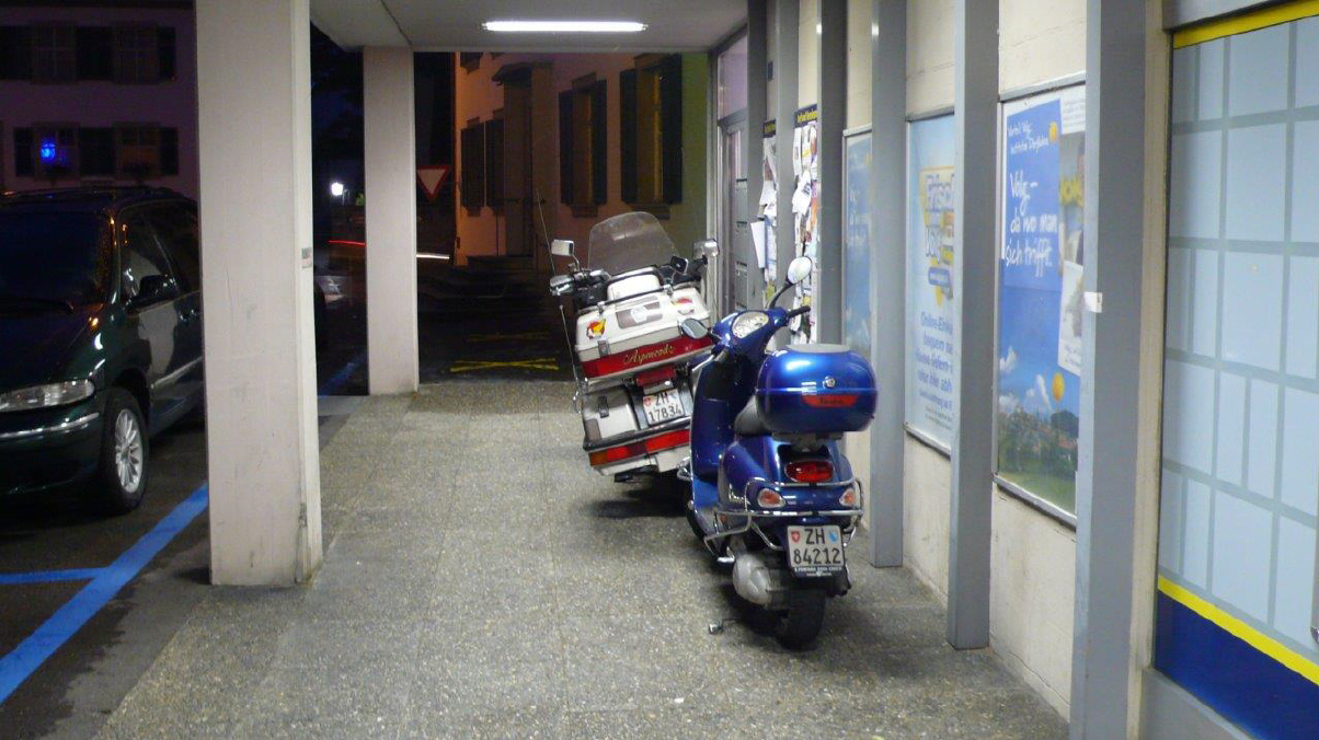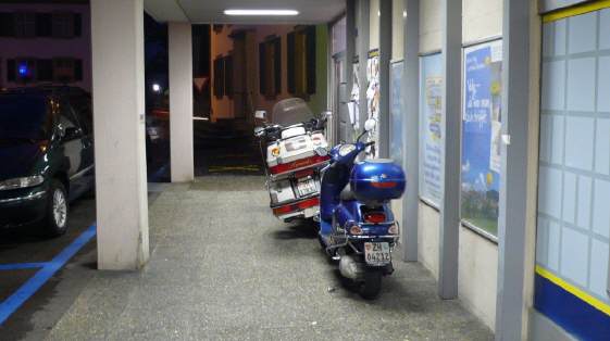 Arthur wurde es zu bunt und bei Altikon drehte er um. So blieben nur noch Milena mit dem Vespa-Roller und ich. Ausgangs Andelfingen fielen die ersten Regentropfen und wir drehten um, versuchten noch einen Platz im Restaurant zu ergattern, bevor es losging. Bei der Suche begegneten wir Cyrill Landolt, einem Fahrlehrer-Kollegen aus dieser Region, und er empfahl uns die «Spätzlipfanne». Da Milena aus dem «Spätzle»-(Schwaben-)Land kommt, war sie dieser Idee nicht abgeneigt. Wir bereuten den Entscheid nicht, eine Seniorenportion hätte mir auch genügt. ;-)