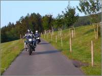 So starteten wir alsbald zu viert, erstens mal über Buchenegg und Albis-Pass. Dann ging es über Sihlbrugg nach Neuheim, wo wir (wie auch die Gruppe von Roland, die in Thalwil gestartet war) die Winzenbachstrasse nehmen wollten: Da die Kreuzung umgestaltet worden war, landete ich auf der Oberlandstrasse, die führt schlussendlich über Schwand zum selben Ort, Brettigen und Hinterbrettigen, bevor sie auf der Strasse Menzingen-Finstersee einmündet. In Finstersee wollten in Richtung Gubel abbiegen, was aber durch eine Baustelle verhindert wurde. So landeten wir über den Gottschalkenberg im Ratenpass und schliesslich wieder in Oberägeri, wo ich eigentlich über Gubel hinfahren wollte. Anschliessend folgten wir dem Ägerisee bis nach Morgarten, wo wir in Richtung Halsegg abbogen. Alle diese Strassen waren mir von 1.Mai-Rallyes bekannt, welche wir bekanntlich 2012 eingestellt hatten. Dass wir dabei auf einige Kilometer Kiesstrassen stossen würden, war nicht so geplant, aber die Gruppe mit Hugo auf der grossen GS (no so gern Chiesstrasse!) und Alain mit seinem Adventure-Look Honda Scooter sowie Beat auf seinem Suzuki Burgman-Roller folgte mir auf der alten BMW R80 GS problemlos. |