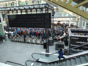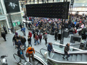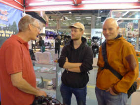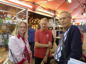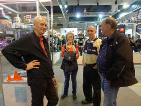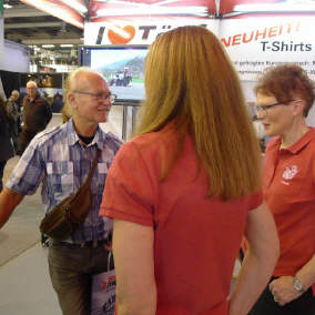 Unser erster Messtag begann bereits um 9.00 Uhr: Am ersten Tag müssen wir immer noch diverse «Finishs» vornehmen. In der Vitrine fehlten noch die Preise bei den einzelnen Artikeln. Auch mussten sich die Helferinnen Übersicht über das Artikellager machen, wo man was fand. In diesem Jahr profitierten wir von einem Lager hinter dem Zelt, der durch den Abstand zum Nachbarstand entstanden war und uns freundlicherweise von der Ausstellungsleitung zur Verfügung gestellt wurde. Milly begab sich zur Eröffnung pünktlich um 10 Uhr: Doch in diesem Jahr gab es keine Eintrittsshow, die Drehkreuze wurden freigegeben und die grosse Masse an Messebesuchern strömte in die Hallen. Durch die Laufrichtung der Rolltreppen wurde in alle Richtungen gefahren: Alsbald waren in unserer Halle unten rechts viele Besucher zwischen den Ständen am schlendern. |