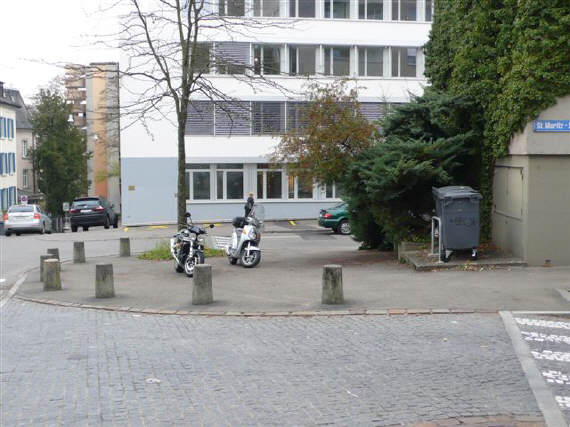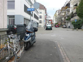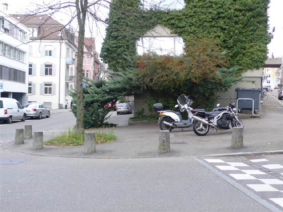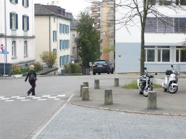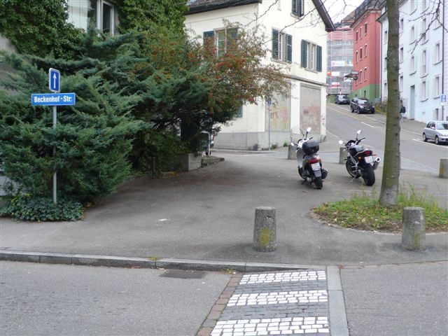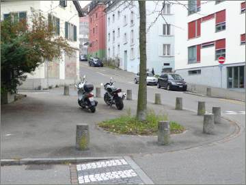 Wie aus der Sicht der obigen Bilder zu entnehmen, ist der Durchgang für Fussgänger in beiden Strassen frei. Da die Kreuzung auf dem ganzen Bereich erhöht ist, benützen die Fussgänger eh den ganzen Bereich, um die Strasse(n) zu überqueren! Es hält sich in dieser Tempo 30-Zone niemand an eine Regel, wo das Trottoir beginnt oder wo die Strasse beginnt - es wird einfach kreuz und quer über die Strasse gelaufen!!! Es ist also müssig, hier von «Trottoir parkieren» zu sprechen, da es KEIN Trottoir gibt. Damit sind wir einmal mehr bei der alten Frage angelangt: «Was ist ein Trottoir?» Solange diese nicht schlüssig beantwortet werden kann, darf es auch keine Bussen für Zweiräder auf einem Trottoir geben. |