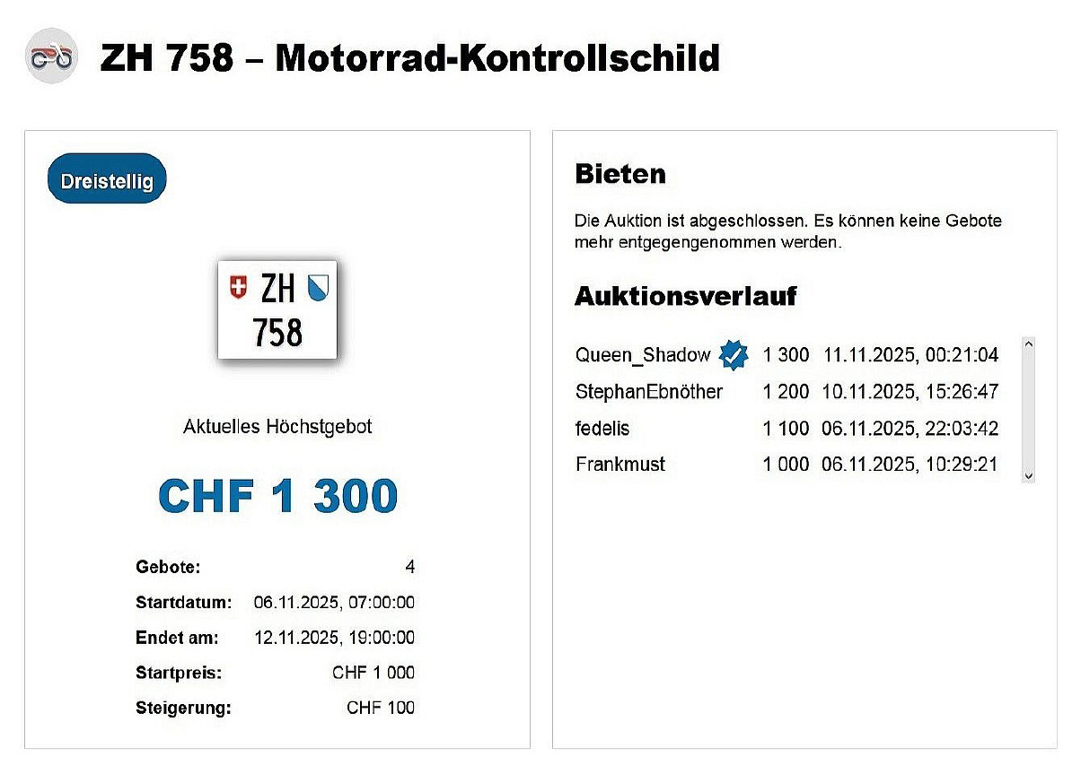 Am 12.11.2025 wurde im Kanton Zürich das nächste 3-stellige TÖFF-Nummernschild ausgegeben - in der Auktion ging es zum äusserst tiefen Preis von nur Fr. 1300.- weg! Verfolge den Verlauf vom «ZH 758
