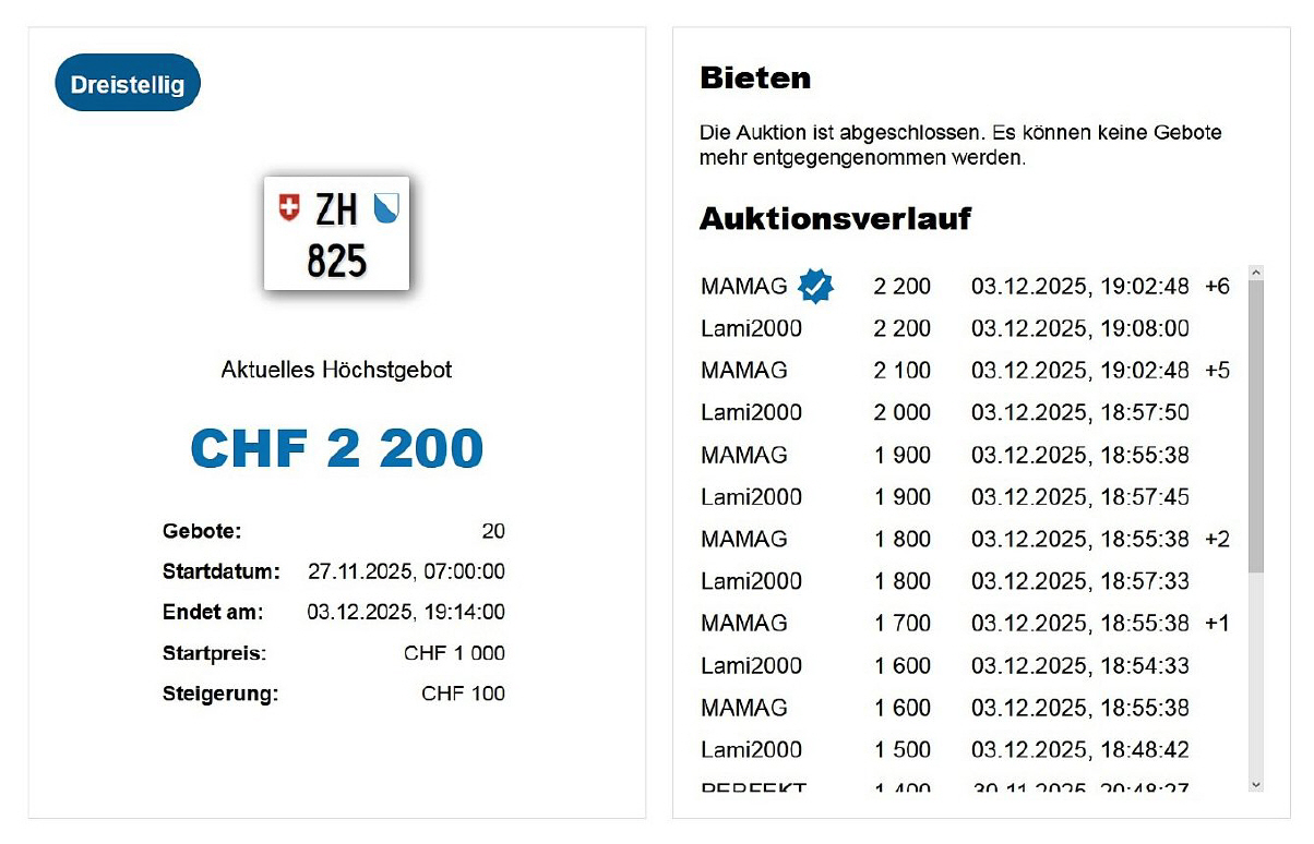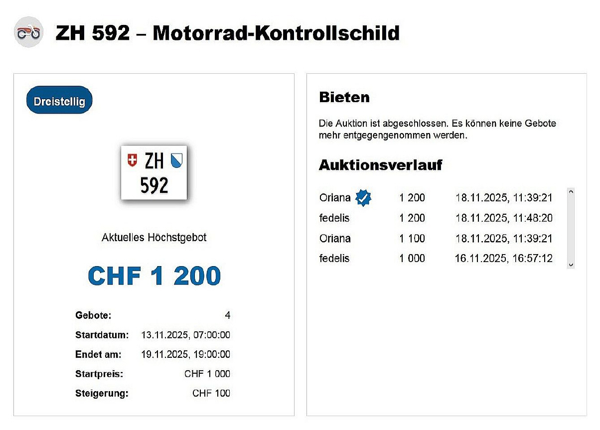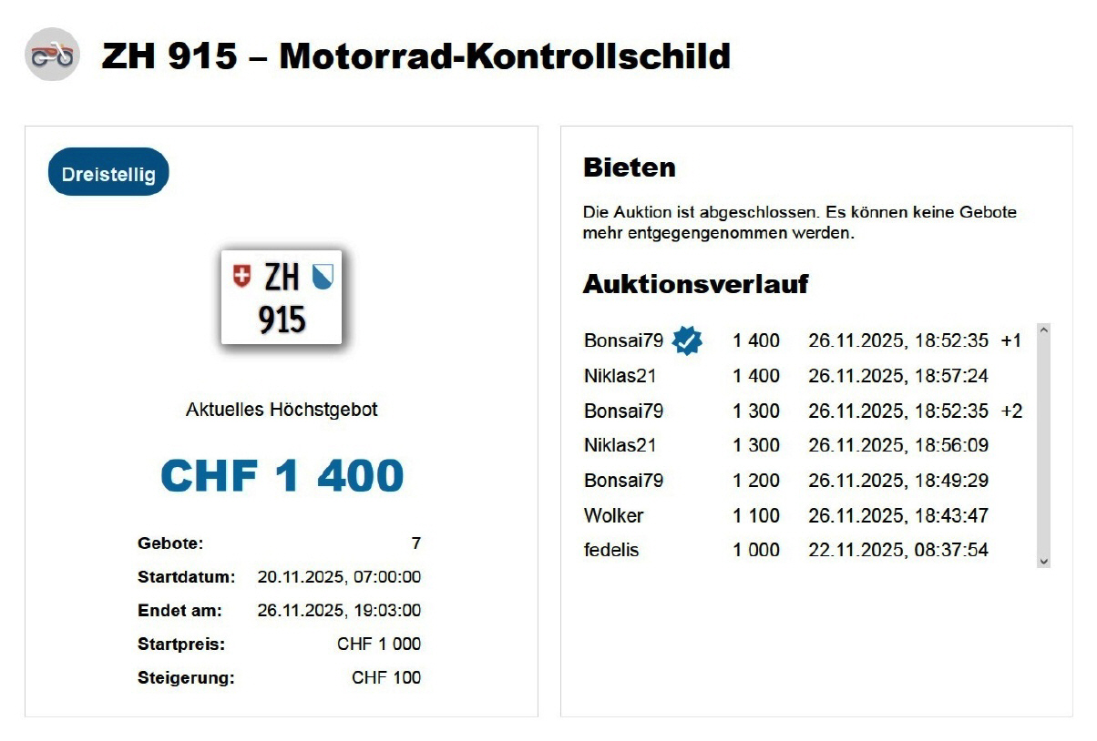 Am 25.11.2020 wurde im Kanton Zürich das 3-stellige TÖFF-Nummernschild ausgegeben - in der Auktion ging es für Fr. 4000.- weg: Auch hier boten sich zwei Bieter hoch! Verfolge den Verlauf vom «ZH 701