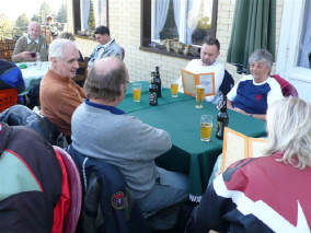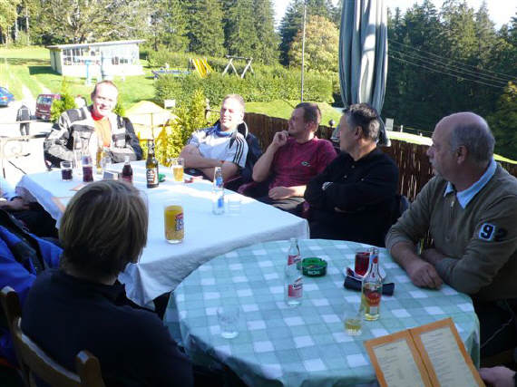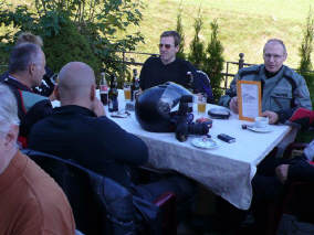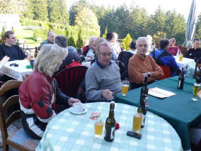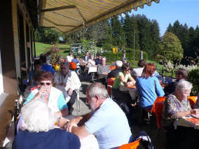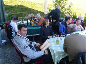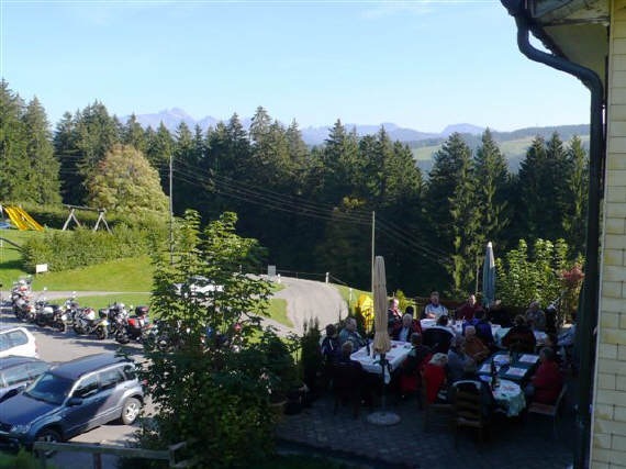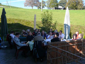 Fast ausnahmslos blieben die Teilnehmer zum verspäteten Mittagessen. Die Fahrt durch die schönen Gegenden hatten gluschtig gemacht . Milly war auch zu uns gestossen. Von ihr kam auch der Vorschlag für diesen exklusiven Aussichtsplatz. Natürlich dauerte es eine Weile, bis alle erst etwas zum Trinken, später das Essen auf dem Tisch hatten. Es war aber ein sehr angenehmer Aufenthalt, in guter Atmospäre und in geselliger Runde. Gegen 5 Uhr brachen alle auf. |