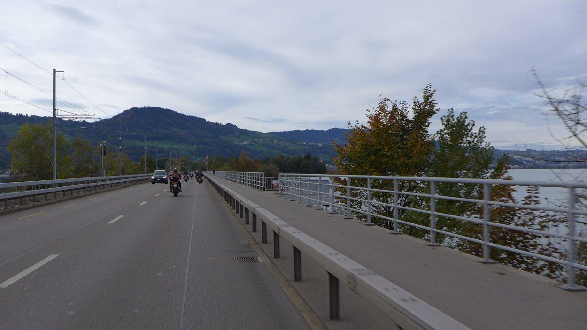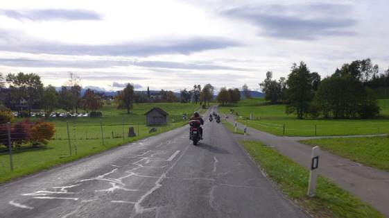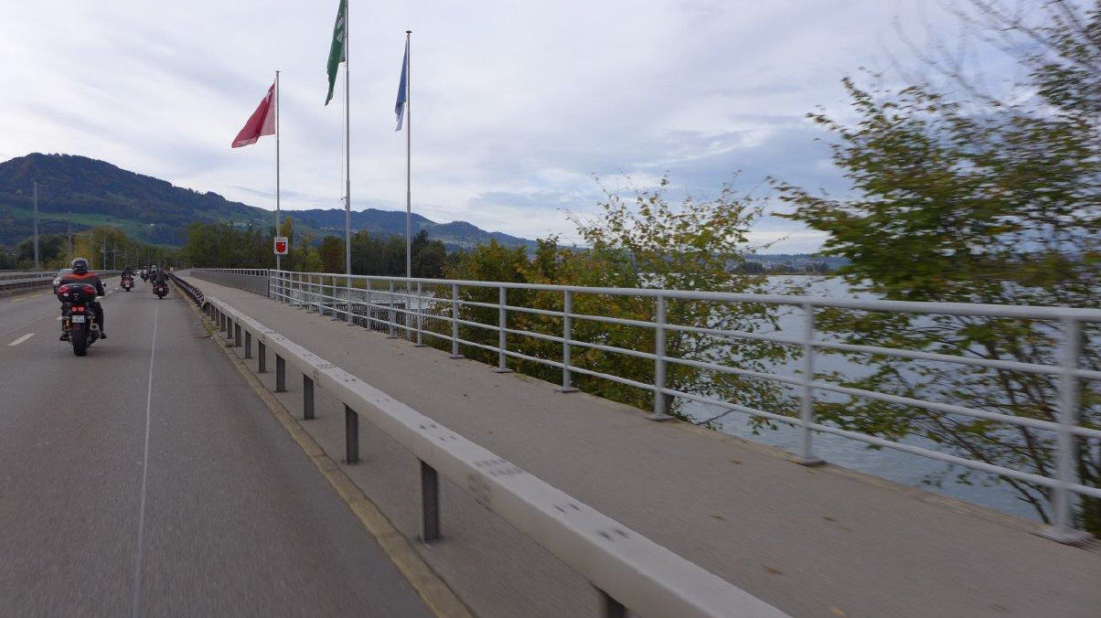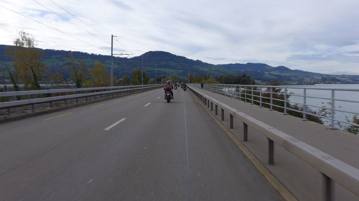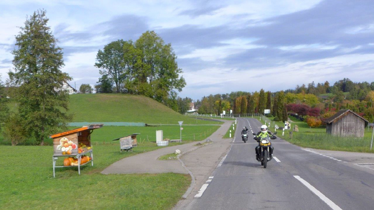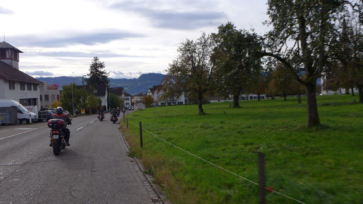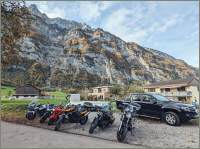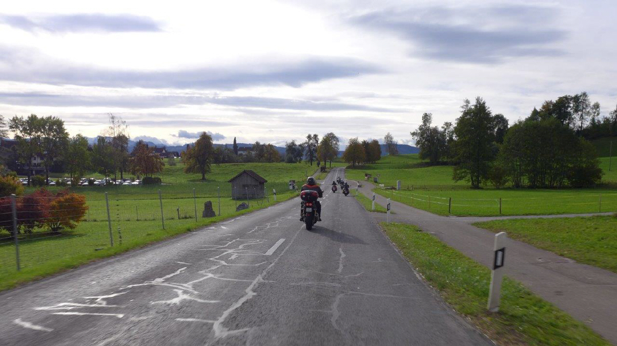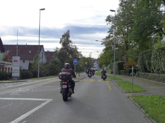 Am Sonntag, 29.Okt. wurde nach Winterzeit gestartet: Als mich der Wecker um 07.15 Uhr aus dem Bett holte, war es eigentlich 08.15 Uhr, zumindest nach meinem Gefühl. Draussen ging gerade die Sonne auf und ich entschied mich, an der Ausfahrt teilzunehmen. Dani gab mir sofort Antwort und meldete als Startzeit 9.30 Uhr für all jene, die auf das Frühstück verzichten. Start war die Bäckerei-Konditorei «Fleischli» in Wallisellen. Ich traf um fünf vor halb 10 Uhr als letzter der Teilnehmer ein, machte die «Hand shake»-Runde und Andrea rief schon bald zum Start. Mit von Partie war Mircea, erstmals mit seiner riesigen GL1500 F6 «Valkery». Er schätzte, bereits etwa 1000 km damit gefahren zu sein. Ich fädelte mich an drittletzter Stelle ein. Yannis fehlte leider aus geschäftlichen Gründen. |
