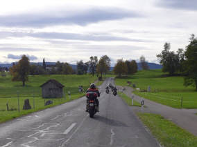 Inzwischen waren die «Sunset Riders» wieder gestartet, es ging nun bergab. Die Strasse war in dieser Jahreszeit frei von irgendwelchen Verunreinigungen des während des Sommers weidenden Rindviehs. Aber sie war immer noch so «ghögerig», wie ich es in meinen 45-jährigen Erinnerungen hatte: Der Urnerboden war jeweils mein Federungstest meiner ersten GoldWing, bei welcher Geschwindigkeit darf man heute gar nicht mehr schreiben. Ja, es gab Zeiten, da durfte man ausserorts auch in der Schweiz so schnell fahren, wie man wollte. Dann führten sie «versuchsweise» Tempo 100 ausserorts ein – und auf Autobahnen Tempo 130 – später, nach einer Volksabstimmung kam dann Tempo-Egli, nach dem damaligen Verkehrsminister benannt, Tempo 80/120. Seither sind alle Töff-Fahrer «kriminalisiert», aber im Gegensatz zu den leichten Drogen, die bis zu einem gewissen Grad Straf-Freiheit geniessen und wahrscheinlich (leider) bald legalisiert werden, wird unserem Hobby mit Tempo 30, aus weiss für was allen Gründen (Schule, Lärmschutz, Umweltschutz, usw.) selbst auf Hauptstrassen scheibchenweise der Garaus gemacht. Und Rennstrecken gibt’s nur im Ausland, wo führt das hin? Um die Wohnbevölkerung zu schützen führen die Strassen um die Dörfer, gerade, schnelle Umfahrungsstrecken für Tempo 80 – zum Einschlafen! |