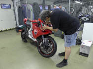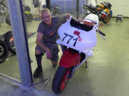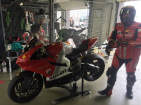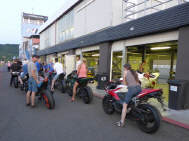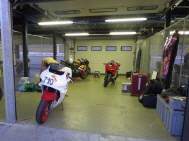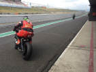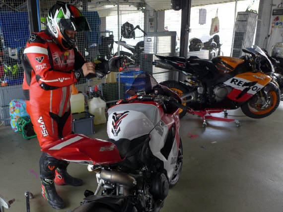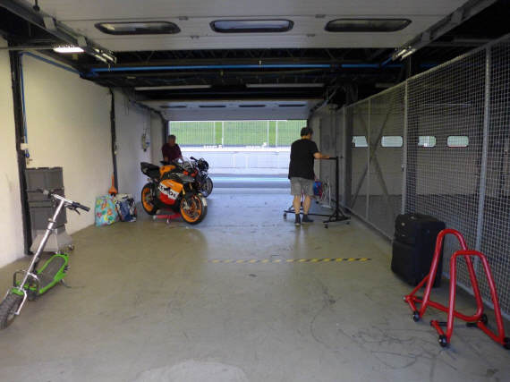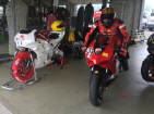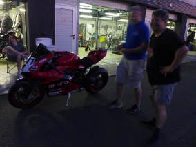 Am selben Abend konnten wir unseren Bus entladen, die Box einrichten, uns anmelden und die Maschine bei der Sicherheitskontrolle zeigen und für den nächsten Tag herrichten: Da wir alle mit Slicks (profillosen Rennreifen) fahren, müssen die mit Reifenwärmern auf Betriebstemperatur gebracht werden. Wenn Claudio und ich morgens vom Hotel kamen, war der Elektroschalter bereits rechtzeitig von Kurt umgelegt: Das ist Service! Zufälligerweise waren wir alle in der zweitschnellsten Gruppe Rot eingeteilt. Tatsächlich bewegten wir uns, Kurt und ich, mit Rundenzeiten, die auch zur gelben Gruppe gepasst hätten. |