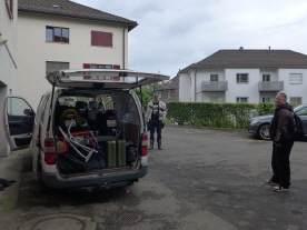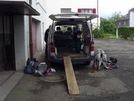 So gestärkt machten wir uns kurz nach 10 Uhr auf den Weg nach Vorarlberg, wo wir noch den Tank mit günstigem Benzin füllten (1.59 €/L 95 Okt). Bereits in der Autobahnauffahrt in Lindau staute sich der Verkehr: Die Polizei führte eine grosse Grenz- & Verkehrskontrolle im Zusammenhang mit der Fussball-EM durch und, dass wir mit unseren Lieferwagen in den Fokus der sehr netten PolizistInnen gerieten, muss wohl kaum extra erwähnt werden. Es blieb aber bei einer Ausweis- und Sichtkontrolle. Wir konnten unbehelligt (insgesamt Stau/Kontrolle mit etwa 3/4-Stunden Verspätung) die Fahrt wieder aufnehmen. |