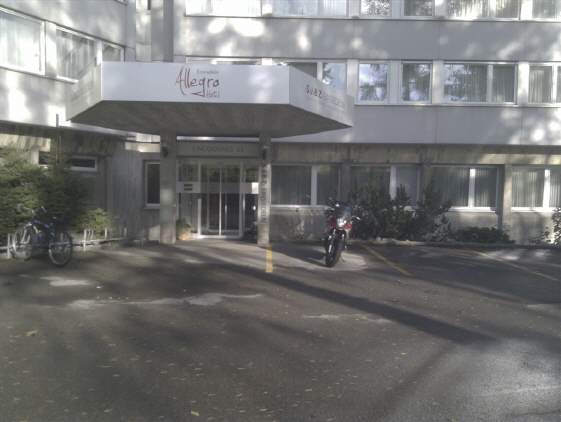 Besammlung der Teilnehmer vor dem Hotel. Beim linken Fahrzeug handelt es sich um ein Fahrrad (ohne Motor) und demzufolge gehört es nicht zu den Teilnehmern.