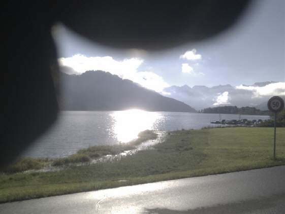 Der Himmel war zwar mit Wolken überdeckt, aber die tiefstehende Sonne fand ihren Weg auf die Strasse und reflektierte dort auf dem Wasserfilm, so dass der Fahrer stark geblendet wurde.