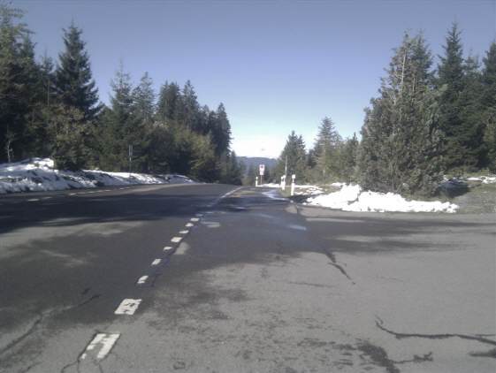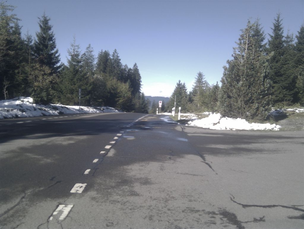 Sicht von der Sattelegg Richtung Sihlsee. Man beachte die Schneemauern links und rechts der Strasse.