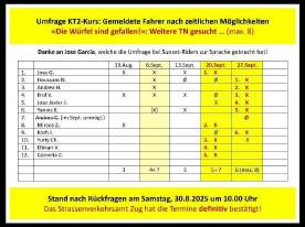 Für den 23.Aug. (Stand: 13.8.) sind 5 definitive TN angemeldet.   Für den 6.Sept. (Stand: 12.8.) sind momentan erst 2 definitive TN, Mindestanzahl liegt bei 4!