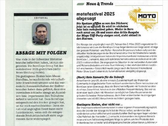 21.7.2024 Nur ganz in Kürze: Vergangene Woche ging die Meldung ein, dass 2025 kein Motofestival mehr stattfinden wird. Ich hatte dies befürchtet, denn mit grosser Garantie war der Auftritt in Bern für die Ausstellenden nicht günstiger als in Zürich. Nur, dass der Anlass in Zürich (der leider 2020 zum letzten Mal stattfand, unmittelbar vor der Pandemie) bereits auf eine grosse Tradition zurückblicken konnte und BesucherInnen von nah und fern in Scharen anzog. Ob Bern je auf die 70'000 Eintritte der SWISS-MOTO gekommen wäre, zweifelten offenbar selbst diejenigen, die bei den ersten zwei Ausgaben brav mitgemacht und investiert haben. Es war eine tolle Ausstellung 2024, mit einem riesigen Rahmenprogramm, inklusive Motorradrennen. Aber offenbar war es zu teuer - da muss selbst die BEA Bern den Stecker ziehen. Schade für die Töff-Szene Schweiz! |